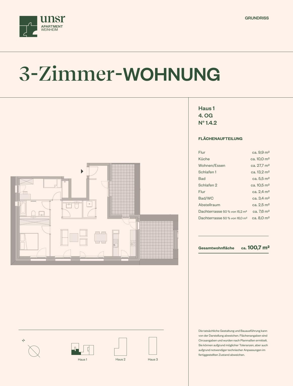 Die beiden Dachterrassen sind nach Südosten ausgerichtet und teilweise überdacht. Angrenzend an den geräumigen Eingangsbereich und die separierte moderne Einbauküche schließt sich der offene Wohnbereich mit Ausrichtung nach Süden an. Die vielen Fenster versprechen absolute Helligkeit im Mittelpunkt der 3-Zimmer-Wohnung. Ergänzt wird das Wohnkonzept durch 2 Schlafzimmer, ein Wannenbad, ein zusätzliches separates WC sowie einen Abstellraum mit Waschmaschinenanschluss.