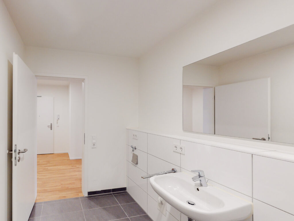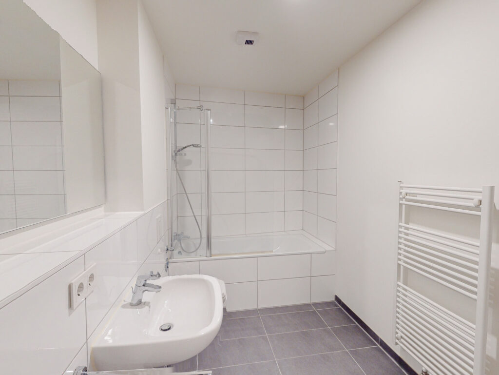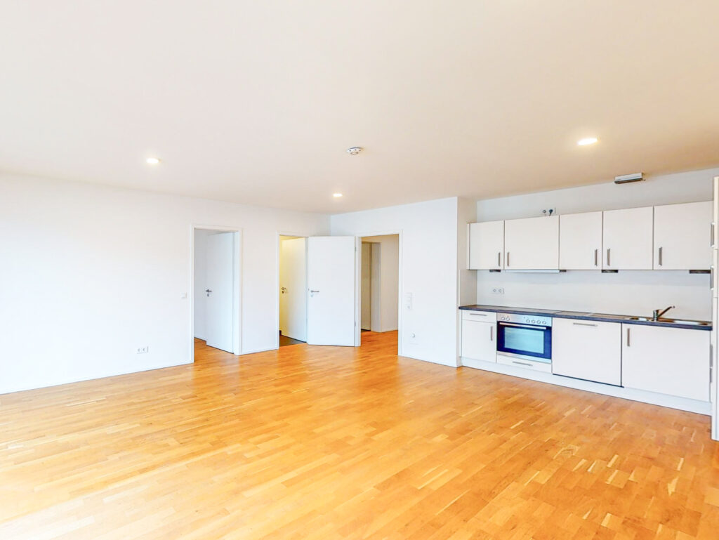 Die kompakte 2-Zimmer-Wohnung wird über einen Flur betreten und von dort erreicht man das Badezimmer mit Badewanne und Waschmaschinenanschluss. Der offene Wohnbereich ist mit einer modernen Einbauküche kombiniert worden und führt über ein bodentiefes Fenster auf den Balkon. Das helle Schlafzimmer rundet das Wohnkonzept mit dem zweiten Zugang zum Balkon ab. Auch für ein Abstellraum ist gesorgt.