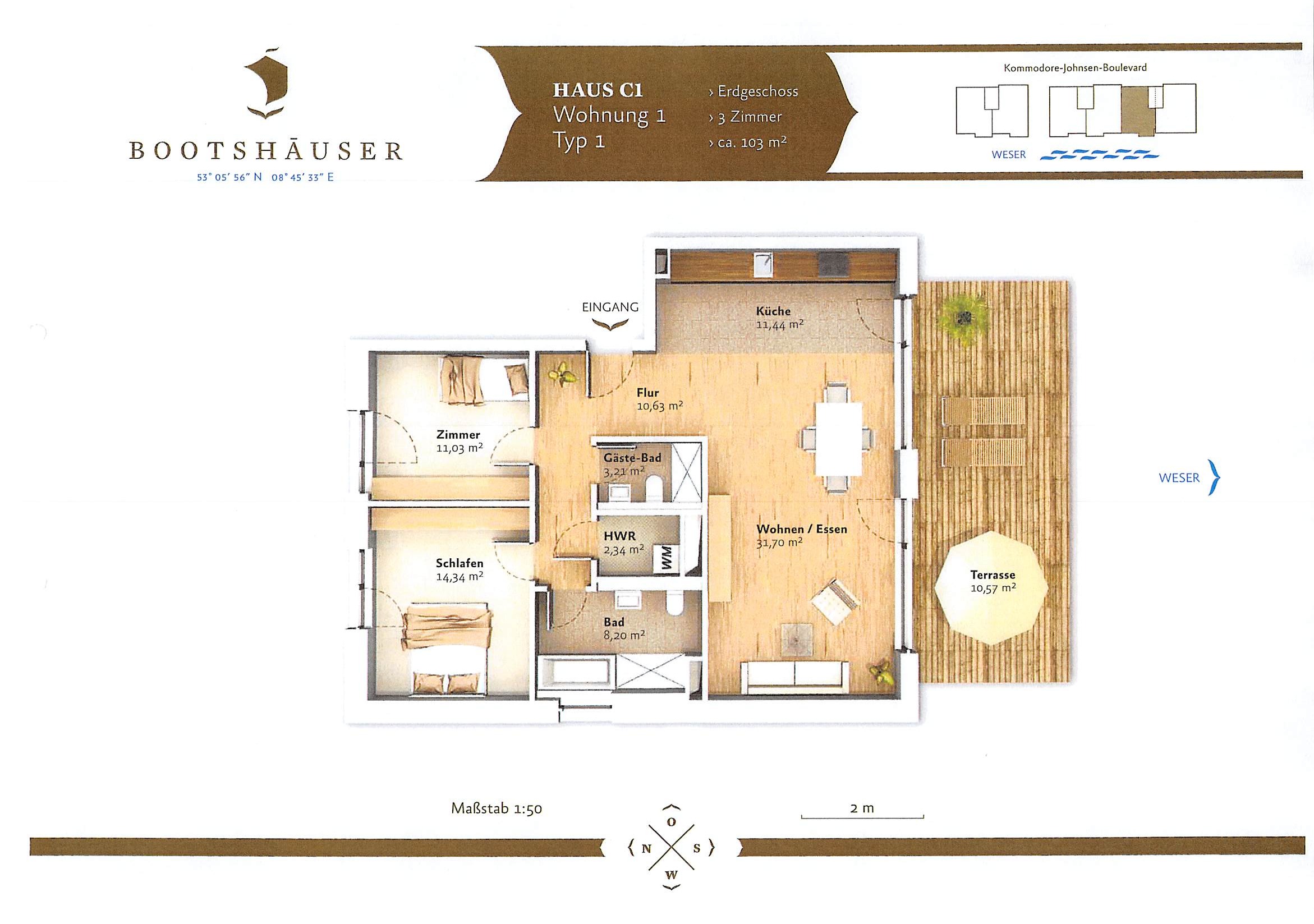 Die modernen Bootshäuser liegen in der Überseestadt direkt an der Weser. Die exklusive Wasserlage ermöglicht es, nach langen, anstrengenden Tagen zu entschleunigen und bei einem Glas Rotwein am Wasser den Tag ausklingen zu lassen. Der weitläufige Strandpark „Waller Sand“ befindet sich in direkter Nachbarschaft und lädt insbesondere an heißen Sommertagen mit Volleyballfeldern und zahlreichen Sitzmöglichkeiten zum Verweilen ein. In unmittelbarer Nähe liegt zudem der Überseepark, welcher mit seinen großen Erholungsflächen, dem Spielplatz und einer Skatebahn für alle Altersklassen etwas zu bieten hat. In Kombination mit dem abwechslungsreichen kulinarischen und kulturellen Angebot entsteht ein ganz eigenes, besonderes Flair der Überseestadt.