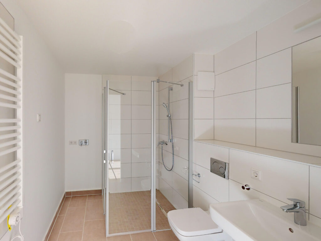Beginnend mit einem geräumigen Flur, welcher durch einen Abstellraum weitere Staufläche ermöglicht, findet sich auf der linken Seite eines von zwei Schlafzimmern. Anschließend befinden sich das Duschbad mit Waschmaschinenanschluss und das zweite Schlafzimmer. Gegenüber eröffnet sich der helle Wohnbereich, welcher mit einer leicht separierten Einbauküche ergänzt wird. Die nach Westen ausgerichtete Terrasse ist sowohl vom Wohnzimmer als auch von einem Schlafzimmer betretbar.