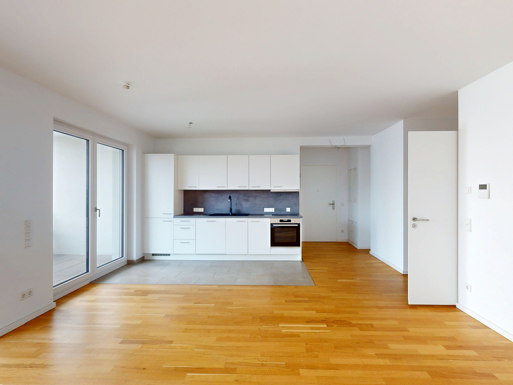 Eine exklusiv geschnittene 3-Zimmer-Wohnung auf einer Fläche von rund 77 Quadratmeter präsentiert sich mit zwei Schlafzimmern, einem Duschbad mit Wanne und einem separaten Gäste-WC. Nachfolgend erstreckt sich ein goßzügiger Ess- und Wohnbereich mit Zugang zur Terrasse/Balkon. Die offene Küche in L-Form rundet das Raumkonzept ab.