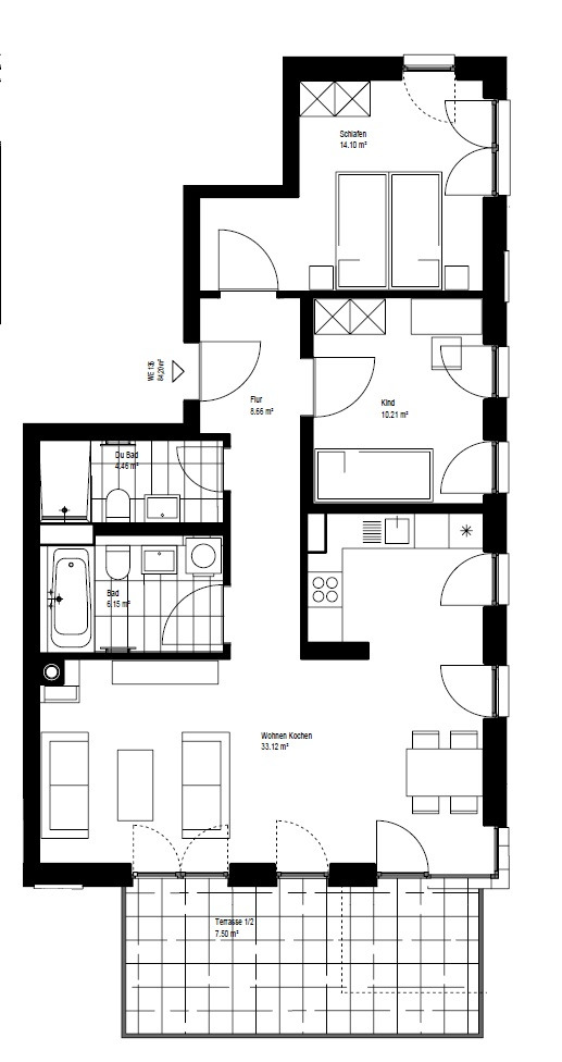 Die 3-Zimmer-Wohnung verfügt über einen großzügigen Wohn- und Essbereich mit offener Küche (inkl. EBK), zwei Schlafzimmer, zwei Bädern (eines davon mit Waschmaschinenanschluss), einen Flur sowie eine Terrasse.