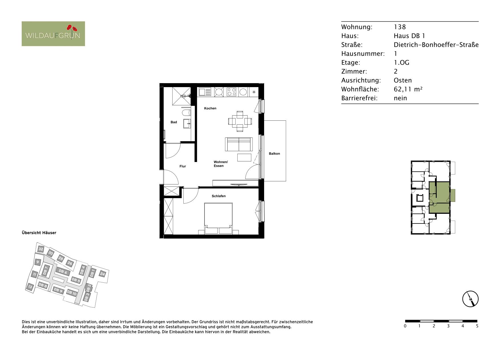 Das wunderschöne Wohnquartier WILDAUFGRÜN umfasst 18 Stadtvillen mit insgesamt 166 Wohnungen und wurde im Jahr 2024 gebaut. Die voll unterkellerten Wohnhäuser sind in dreigeschossiger Massivbauweise errichtet, deren Dachgeschoss als Staffelgeschoss konzipiert ist und auf diese Weise großzügig Platz für umlaufende Dachterrassen bietet. Die Dächer selbst werden extensiv begrünt. Neben Anforderungen an ein KfW-Effizienzhaus 55 (GEG) erfüllen die Gebäude auch die Vorschriften des erhöhten Schallschutzes, die Kriterien der aktuell gültigen EnEV und verfügen über eine effiziente Be- und Entlüftungstechnik. In den Untergeschossen befinden sich Technik- u. Hausanschlussräume sowie Abstellräume für Fahrräder, Kinderwagen und Rollatoren. Auch die Mieterkeller liegen in den Untergeschossen. Die ebenfalls wohnungsweise zugewiesenen Pkw-Stellplätze befinden sich im Außenbereich. Alle umgebenden Grünflächen folgen einem landschaftsplanerischen Konzept. Neben dem innenliegenden Quartiersplatz und einem großzügigen Spielbereich finden sich gemeinschaftlich genutzte Rasenflächen, eine Wildblumenwiese und zahlreiche Blühstreifen, die als Linden- und Rosengärten gestaltet sind. Neuanpflanzungen von Gehölzen, Hecken und Bäumen sorgen für Struktur und schattige Ruhezonen.