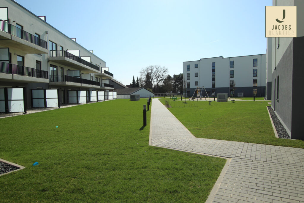 Jedes Haus verfügt über einen Aufzug. Die Innenhöfe wurden aufwändig und ansprechend angelegt und bieten kleinen Bewohner*innen einen eigenen Spielplatz.