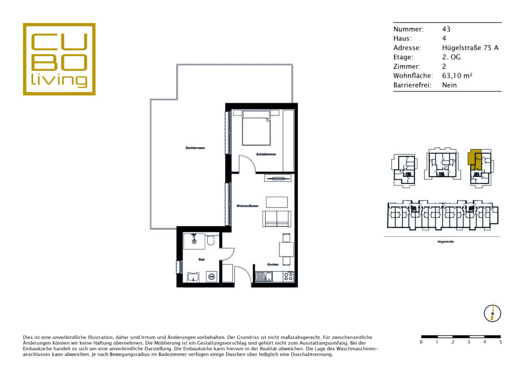 Das Objekt CUBO-LIVING in der Hügelstraße besteht aus einem Gebäuderiegel entlang der Straße sowie drei Hofhäusern und umfasst 93 Wohn- und drei Gewerbeeinheiten. Die 1- bis 3-Raum-Wohnungen verteilen sich dabei auf die vier Gebäude mit insgesamt drei bzw. sechs Geschossen. Eine Tiefgarage verbindet die alle Gebäude und bietet 50 Stellplätze.