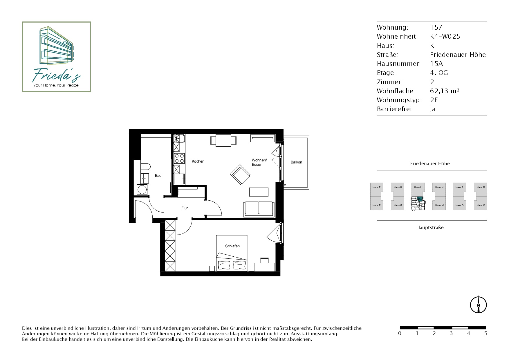 Mit dem FRIEDAS Berlin entsteht auf einem Areal von ca. 24.366 m2 ein modernes Wohnquartier. Der gesamte Neubau-Komplex in der Friedenauer Höhe umfasst sechs Gebäude mit insgesamt 396 Wohnungen, die in drei Bauabschnitten fertiggestellt werden. Im ersten Bauabschnitt entstehen 132 Wohnungen mit einem bis vier Zimmern, teilweise barrierefrei, sowie 69 TG-Stellplätze. Neben der Tiefgarage befinden sich im Untergeschoss auch Abstell-, Fahrrad-, Technik- und Müllräume sowie die Mieterkeller. Die moderne Architektur, bodentiefe Fenster und eine harmonische Farbgestaltung der Fassaden überzeugen ebenso wie die abwechslungsreich begrünten Außenanlagen. In Massivbaubauweise errichtet und erbaut gemäß den aktuell gültigen Bestimmungen der EnEV, erfüllen sämtliche Gebäude die Standards des GEG und „Effizienzhaus 55 EE“ sowie die Vorschriften des erhöhten Schallschutzes. Die Wärme- und Warmwasserversorgung sichert ein Blockheizkraftwerk. Die gärtnerische Gestaltung der Freiflächen umfasst Rasen und Pflanzbeete mit Stauden sowie Hecken, Sträucher und Kleingehölze. Die Abgrenzung der Erdgeschoss-Terrassen erfolgt ebenfalls durch Hecken. Ein Spielbereich für die Kleinsten mit Sandkasten und Spielgeräten wird ergänzt durch ebenerdige Spielflächen für Schach, Mühle oder Mensch-ärgere-dich-nicht.