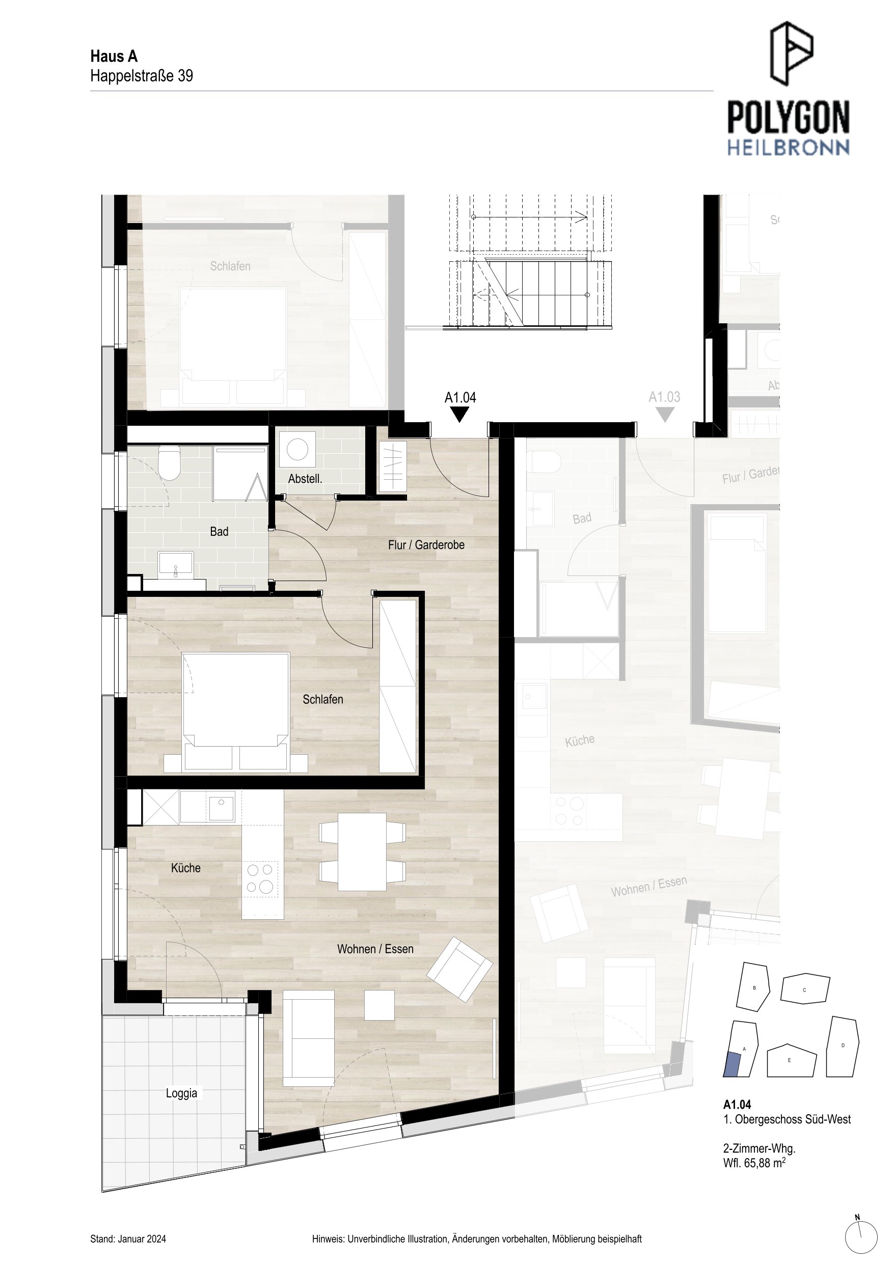 Das Wohnbauprojekt POLYGON umfasst den Neubau von fünf Mehrfamilienhäusern auf einem ca. 3.287 m2 großen Grundstück an der Happelstraße in Heilbronn. Auffallend sind die außergewöhnliche Architektur der Gebäude, deren polygonale Formen unterschiedliche Traufhöhen ergeben und spannende räumliche Situationen schaffen. Jede Gebäudeseite besticht mit einer individuellen Optik und Kubatur – und ohne die sonst übliche Einteilung der Fassaden in Vorder- und Rückseite. Ein zentraler begrünter Innenhof erschließt die Wohngebäude und die gemeinsame zweigeschossige Tiefgarage. Neben Anforderungen an ein KfW-Effizienzhaus 55 (GEG) erfüllen sämtliche Gebäude auch die Vorschriften des Schallschutzes und verfügen über eine effiziente Be- und Entlüftungstechnik. Sie werden nach den Standards der EnEV 2016 errichtet und erhalten wärmegedämmte Außenwände sowie eine Dachbegrünung. Insgesamt entstehen im POLYGON 69 freifinanzierte und 20 geförderte Wohneinheiten sowie 92 Stellplätze in der Tiefgarage. Der Wohnungsmix umfasst 1,5- bis 4-Zimmer-Wohnungen mit Wohnflächen von 35 bis 147 m2.