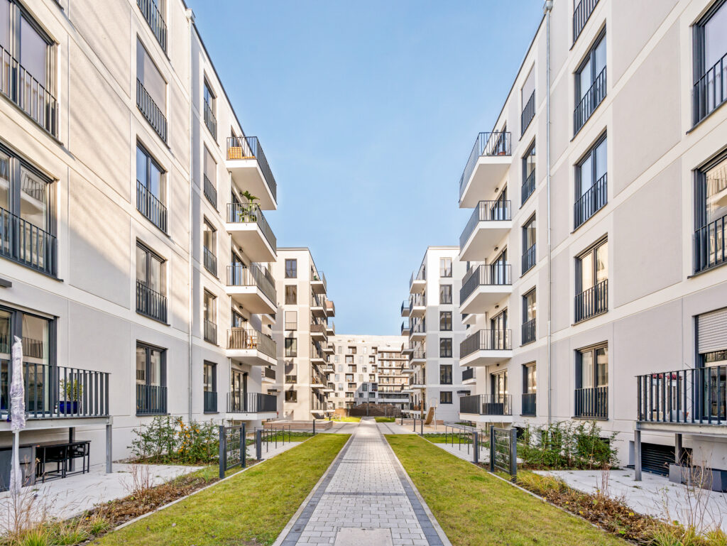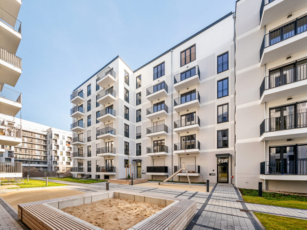 Mit dem FRIEDAS Berlin entsteht auf einem Areal von ca. 24.366 m2 ein modernes Wohnquartier. Der gesamte Neubau-Komplex in der Friedenauer Höhe umfasst sechs Gebäude mit insgesamt 396 Wohnungen, die in drei Bauabschnitten fertiggestellt werden. Im ersten Bauabschnitt entstehen 132 Wohnungen mit einem bis vier Zimmern, teilweise barrierefrei, sowie 69 TG-Stellplätze. Neben der Tiefgarage befinden sich im Untergeschoss auch Abstell-, Fahrrad-, Technik- und Müllräume sowie die Mieterkeller. Die moderne Architektur, bodentiefe Fenster und eine harmonische Farbgestaltung der Fassaden überzeugen ebenso wie die abwechslungsreich begrünten Außenanlagen. In Massivbaubauweise errichtet und erbaut gemäß den aktuell gültigen Bestimmungen der EnEV, erfüllen sämtliche Gebäude die Standards des GEG und „Effizienzhaus 55 EE“ sowie die Vorschriften des erhöhten Schallschutzes. Die Wärme- und Warmwasserversorgung sichert ein Blockheizkraftwerk. Die gärtnerische Gestaltung der Freiflächen umfasst Rasen und Pflanzbeete mit Stauden sowie Hecken, Sträucher und Kleingehölze. Die Abgrenzung der Erdgeschoss-Terrassen erfolgt ebenfalls durch Hecken. Ein Spielbereich für die Kleinsten mit Sandkasten und Spielgeräten wird ergänzt durch ebenerdige Spielflächen für Schach, Mühle oder Mensch-ärgere-dich-nicht.