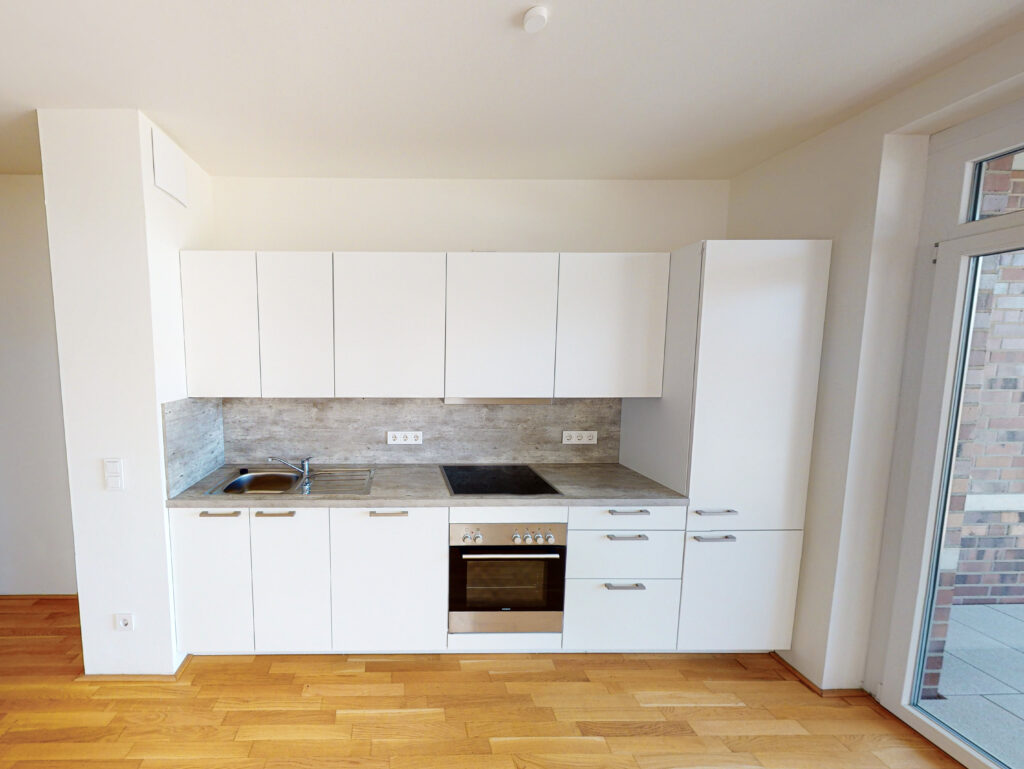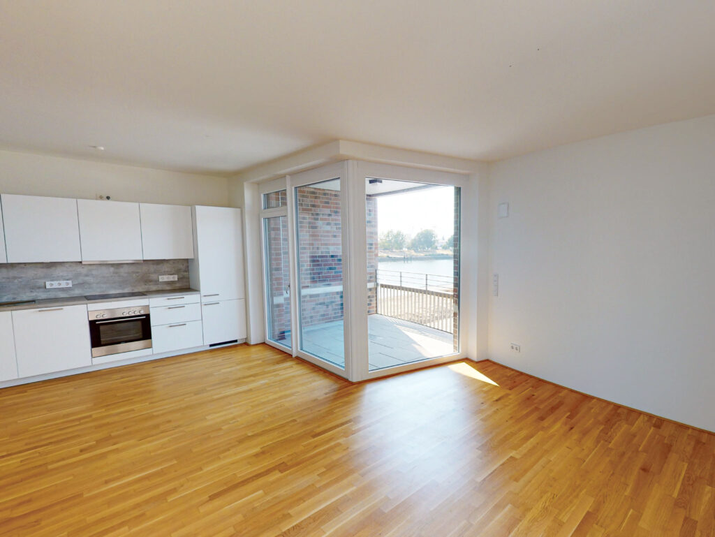 Bei der angebotenen Wohnung handelt es sich um eine 2-Zimmer-Wohnung. Beim Betreten der Wohnung gelangt man in einen Flurbereich mit Nische für einen Schrank, eine Kommode oder eine Ankleide. Über den Flur sind das moderne Duschbad mit Waschmaschinenanschluss und das großzügige Wohnzimmer mit offener Küche (inkl. Einbauküche) erschlossen. Vom Wohnzimmer hat man Zugang zu einem Schlafzimmer mit etwa 13 m² sowie einer gemütlichen Loggia mit Nord-West-Ausrichtung. Die Wohnung liegt in zweiter Wasserreihe. Weiterhin kann ein Tiefgaragenstellplatz angemietet werden. Zudem bietet ein Kellerraum weitere Staufläche.