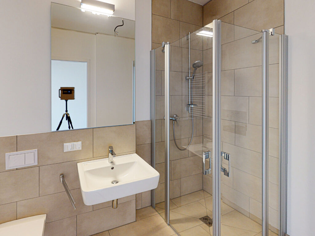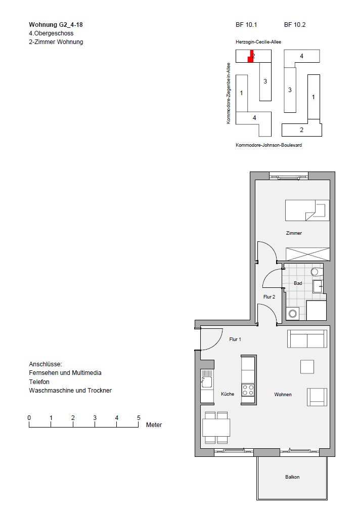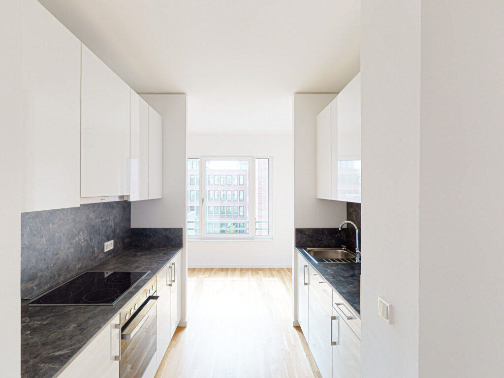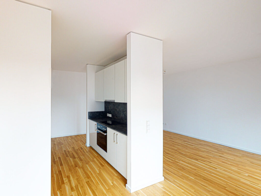 Die hier angebotene 2-Zimmer-Wohnung ist Teil dieses Quartiers und überzeugt insbesondere durch ihren durchgesteckten Grundriss, der für eine hervorragende Luftzirkulation sorgt. Beim Betreten der Wohnung gelangt man zunächst in einen Flur, von dem aus Zugang zum offenen Wohn- und Essbereich mit moderner Einbauküche und Balkon sowie zu einem weiteren Flur besteht. Im hinteren Bereich der Wohnung befindet sich das Badezimmer mit ebenerdiger Dusche und Waschmaschinenanschluss sowie das Schlafzimmer. Weiterhin kann ein Tiefgaragenstellplatz angemietet werden. Zudem bietet ein Kellerraum weitere Staufläche.
