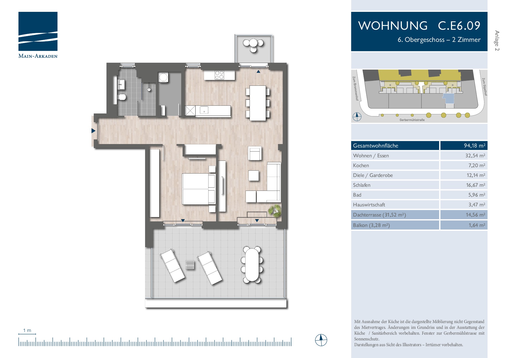 Die hier angebotene 2-Zimmer-Wohnung befindet sich im Gebäudeensemble "Main Arkaden" in Sachsenhausen, Frankfurt.