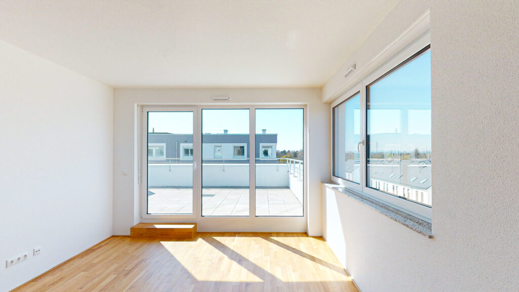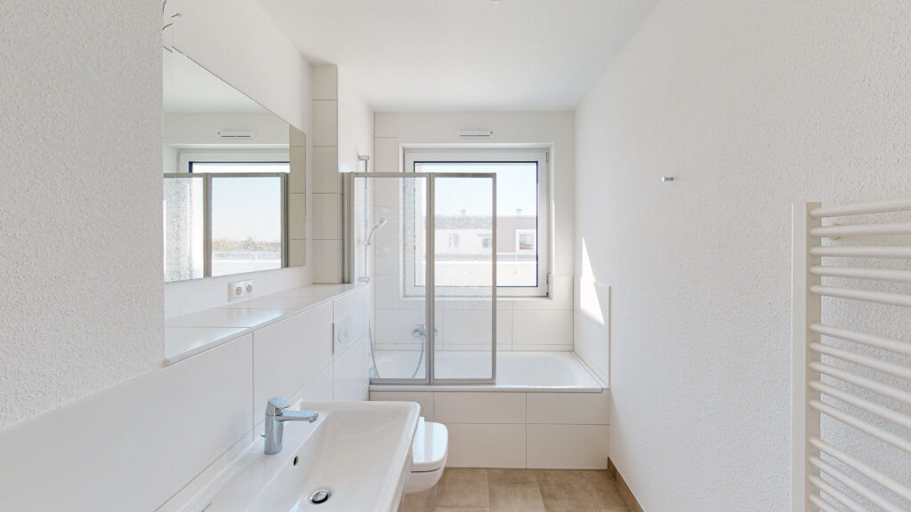 Über einen Flur erreichen Sie sowohl die beiden Schlafräume als auch das moderne Tageslichtbad mit Badewanne und Waschmaschinenanschluss. Die Dachterrasse bietet einen tollen Blick über das Quartier und ist über den Wohnbereich zugänglich.
