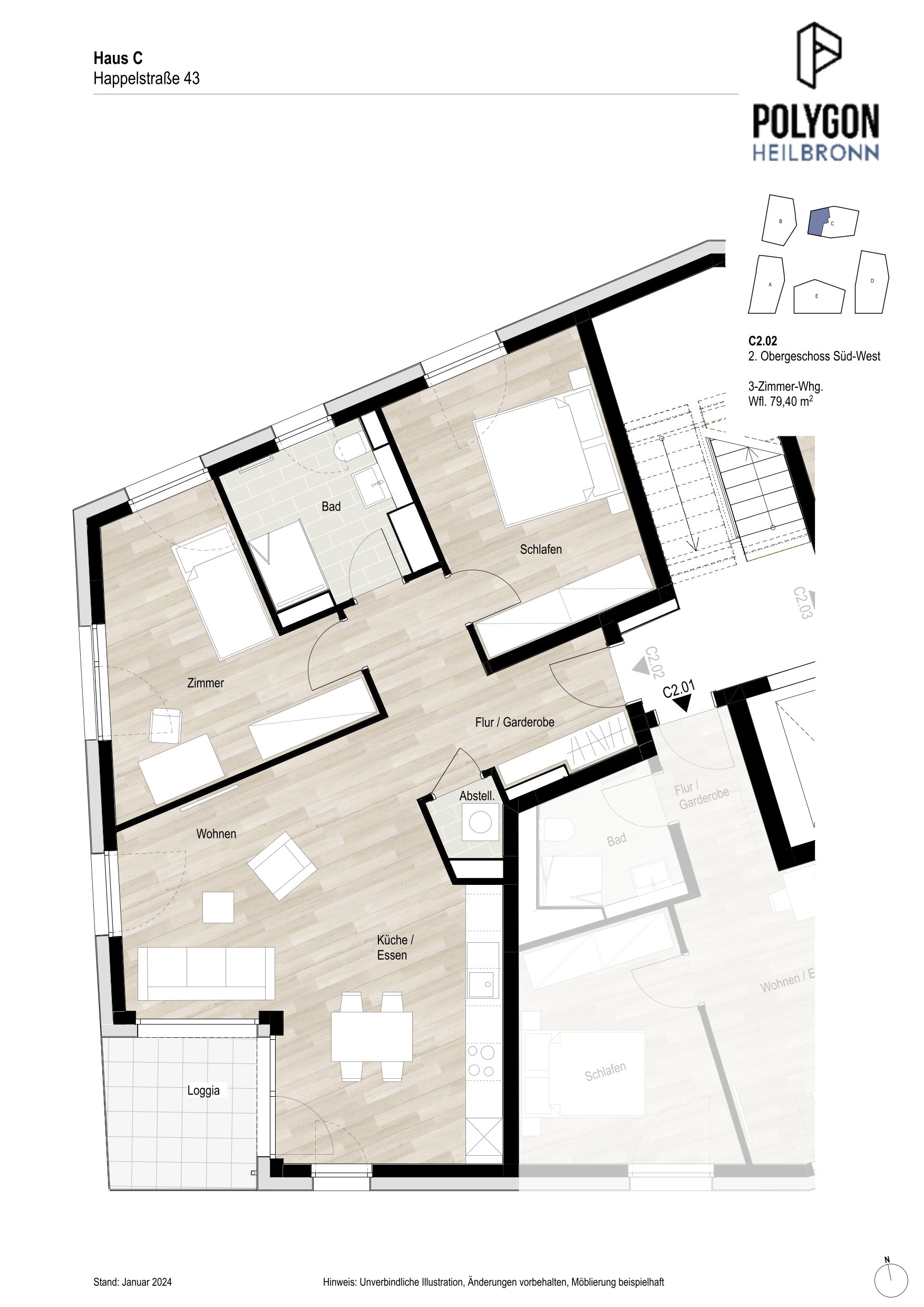 Das Wohnbauprojekt POLYGON umfasst den Neubau von fünf Mehrfamilienhäusern auf einem ca. 3.287 m2 großen Grundstück an der Happelstraße in Heilbronn. Auffallend sind die außergewöhnliche Architektur der Gebäude, deren polygonale Formen unterschiedliche Traufhöhen ergeben und spannende räumliche Situationen schaffen. Jede Gebäudeseite besticht mit einer individuellen Optik und Kubatur – und ohne die sonst übliche Einteilung der Fassaden in Vorder- und Rückseite. Ein zentraler begrünter Innenhof erschließt die Wohngebäude und die gemeinsame zweigeschossige Tiefgarage. Neben Anforderungen an ein KfW-Effizienzhaus 55 (GEG) erfüllen sämtliche Gebäude auch die Vorschriften des Schallschutzes und verfügen über eine effiziente Be- und Entlüftungstechnik. Sie werden nach den Standards der EnEV 2016 errichtet und erhalten wärmegedämmte Außenwände sowie eine Dachbegrünung. Insgesamt entstehen im POLYGON 69 freifinanzierte und 20 geförderte Wohneinheiten sowie 92 Stellplätze in der Tiefgarage. Der Wohnungsmix umfasst 1,5- bis 4-Zimmer-Wohnungen mit Wohnflächen von 35 bis 147 m2.