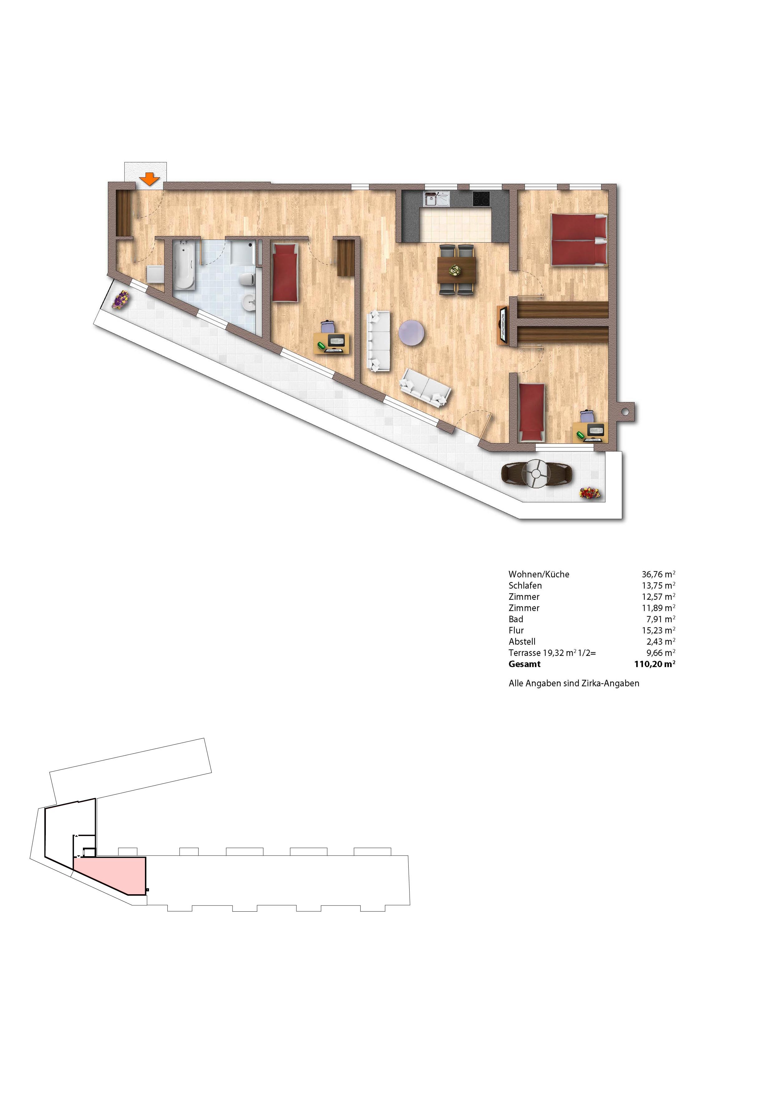 Die Wohnung erstreckt sich über eine großzügige Fläche von 110 m² und präsentiert einen kombinierten Wohn- und Essbereich, der nahtlos in einen Bereich mit Platz für Ihre individuelle Einbauküche übergeht. Drei geräumige Schlafzimmer bieten ausreichend Platz für Komfort und Privatsphäre. Ein ansprechendes Badezimmer, ein praktischer Abstellraum sowie ein einladender Flur ergänzen das Raumangebot. Ein besonderes Highlight ist die Dachterrasse, die einen Raum im Freien schafft, um die Aussicht und frische Luft zu genießen.