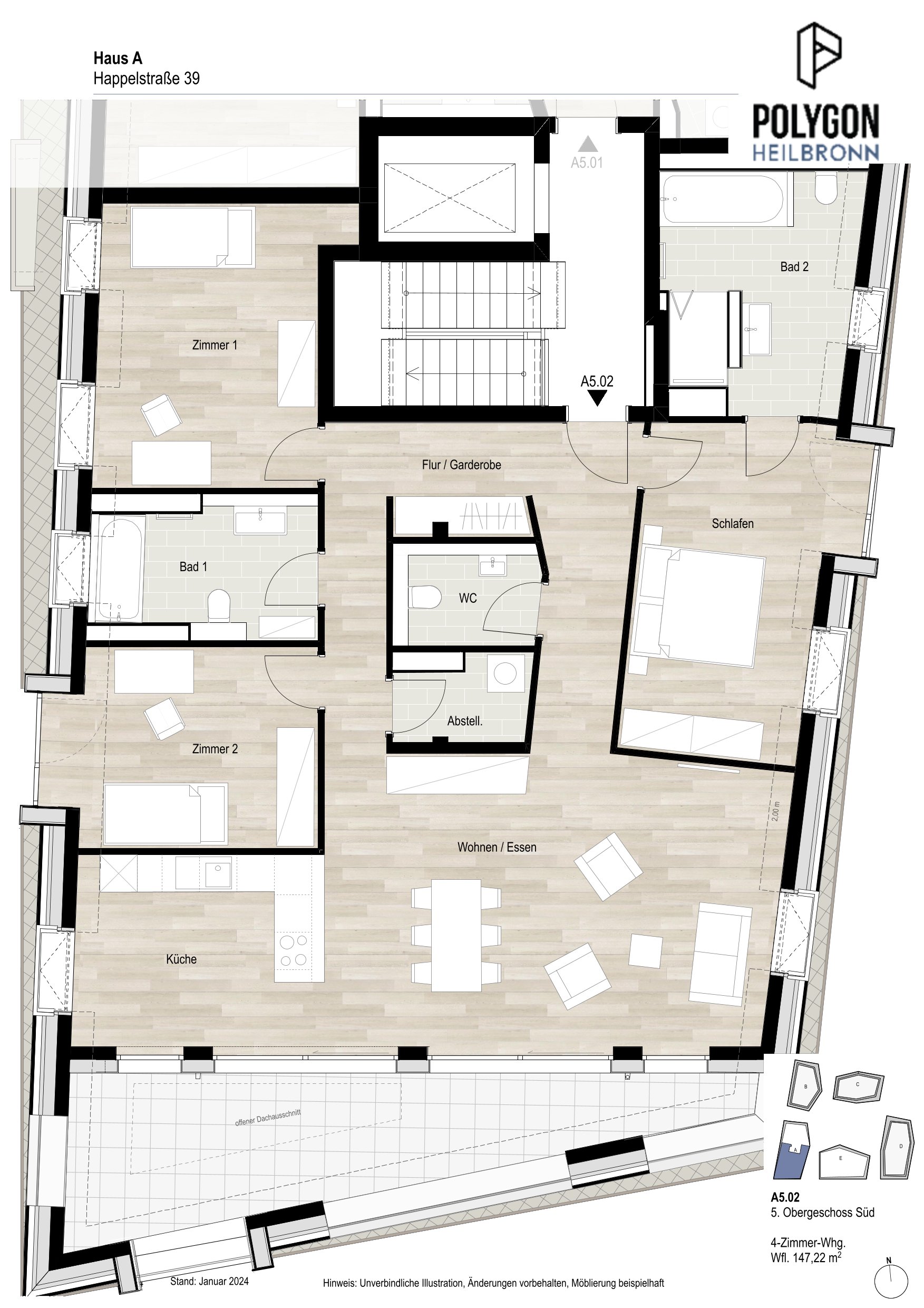 Das Wohnbauprojekt POLYGON umfasst den Neubau von fünf Mehrfamilienhäusern auf einem ca. 3.287 m2 großen Grundstück an der Happelstraße in Heilbronn. Auffallend sind die außergewöhnliche Architektur der Gebäude, deren polygonale Formen unterschiedliche Traufhöhen ergeben und spannende räumliche Situationen schaffen. Jede Gebäudeseite besticht mit einer individuellen Optik und Kubatur – und ohne die sonst übliche Einteilung der Fassaden in Vorder- und Rückseite. Ein zentraler begrünter Innenhof erschließt die Wohngebäude und die gemeinsame zweigeschossige Tiefgarage. Neben Anforderungen an ein KfW-Effizienzhaus 55 (GEG) erfüllen sämtliche Gebäude auch die Vorschriften des Schallschutzes und verfügen über eine effiziente Be- und Entlüftungstechnik. Sie werden nach den Standards der EnEV 2016 errichtet und erhalten wärmegedämmte Außenwände sowie eine Dachbegrünung. Insgesamt entstehen im POLYGON 69 freifinanzierte und 20 geförderte Wohneinheiten sowie 92 Stellplätze in der Tiefgarage. Der Wohnungsmix umfasst 1,5- bis 4-Zimmer-Wohnungen mit Wohnflächen von 35 bis 147 m2.
