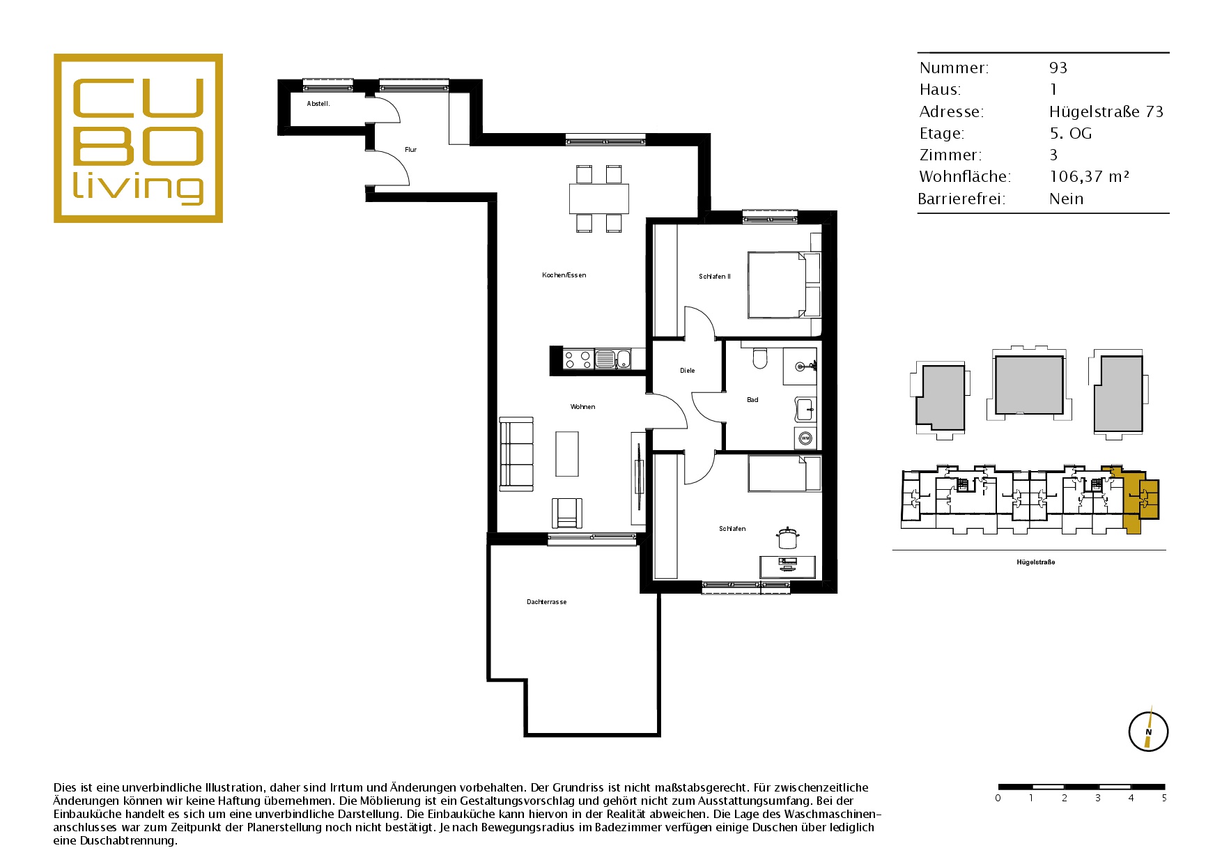 Das Objekt CUBO-LIVING in der Hügelstraße besteht aus einem Gebäuderiegel entlang der Straße sowie drei Hofhäusern und umfasst 93 Wohn- und drei Gewerbeeinheiten. Die 1- bis 3-Raum-Wohnungen verteilen sich dabei auf die vier Gebäude mit insgesamt drei bzw. sechs Geschossen. Eine Tiefgarage verbindet die alle Gebäude und bietet 50 Stellplätze.