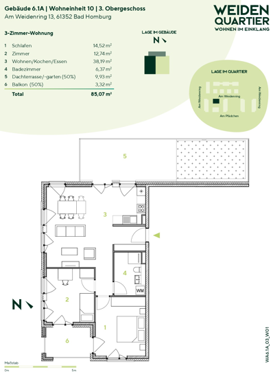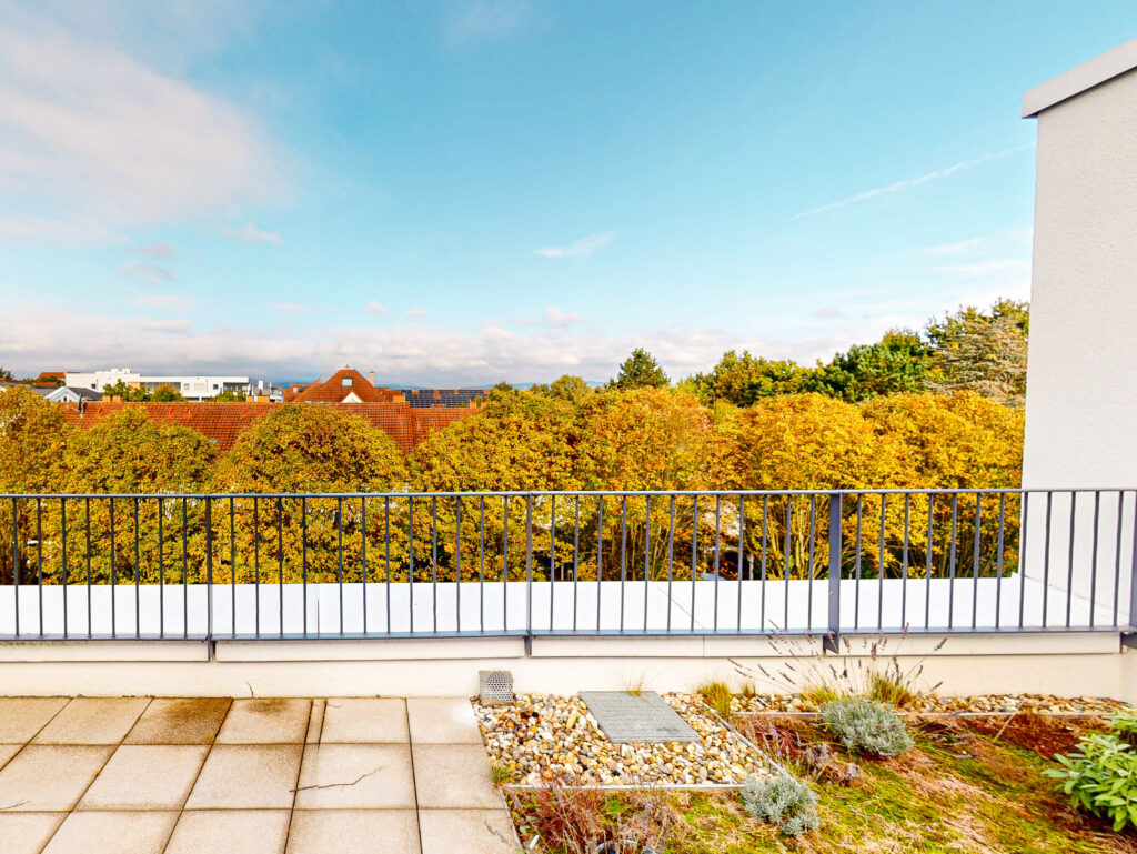 Die modern geschnittene 3-Zimmer-Wohnung verfügt über zwei Schlafzimmer sowie einen kompakten Wohn- und Essbereich mit einer L-förmigen Küche (inkl. Einbauküche). Über das Wohnzimmer gelangt man zur Dachterrasse und über die zwei Schlafzimmer zum Balkon. Das Duschbad ist mit einem Waschmaschinenanschluss ausgestattet.