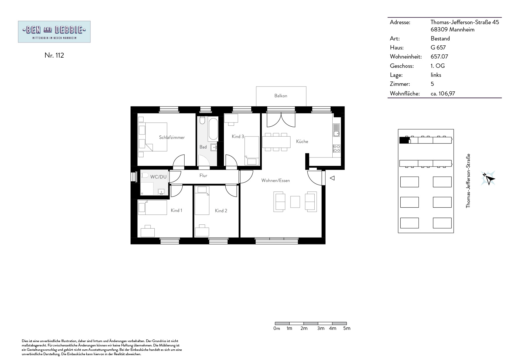 Die hier angebotene 5-Zimmer-Wohnung befindet sich im sanierten Bestandsgebäude des Ben & Debbie im neuen Stadtviertel Franklin. Die Wohnung verfügt über rund 110 Quadratmeter mit einem offenen Wohn-, Koch- und Essbereich.