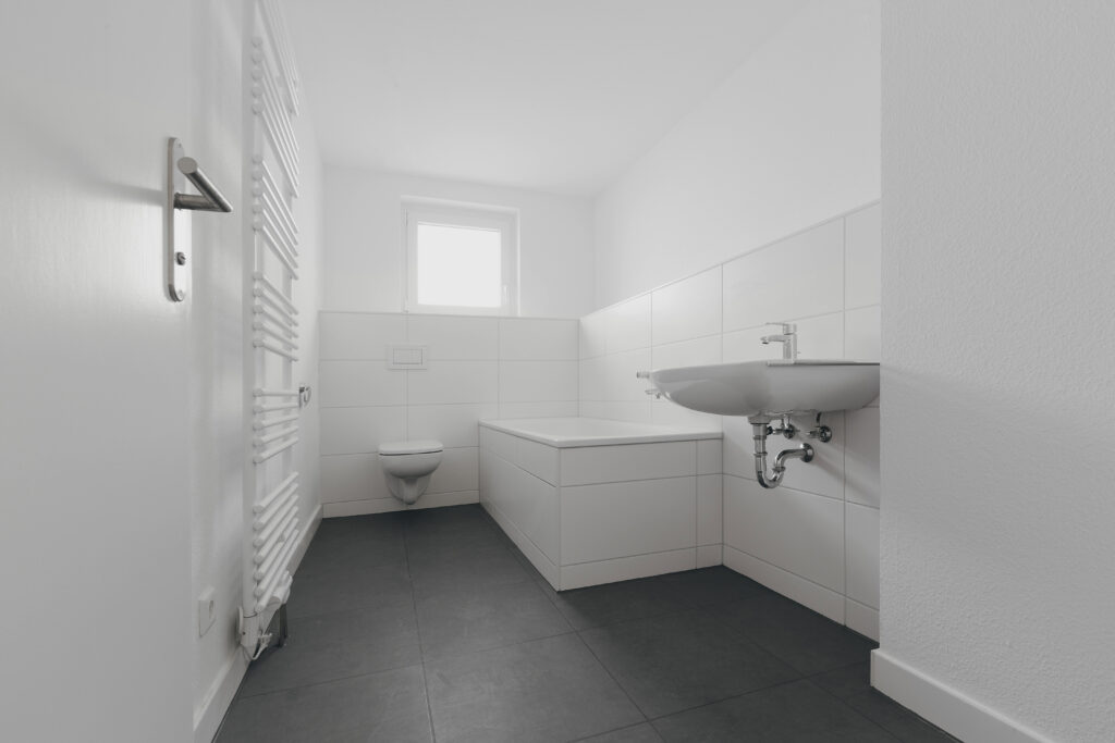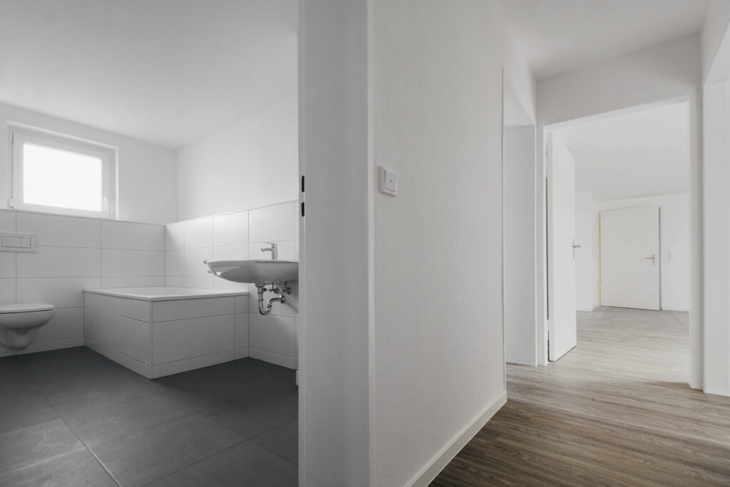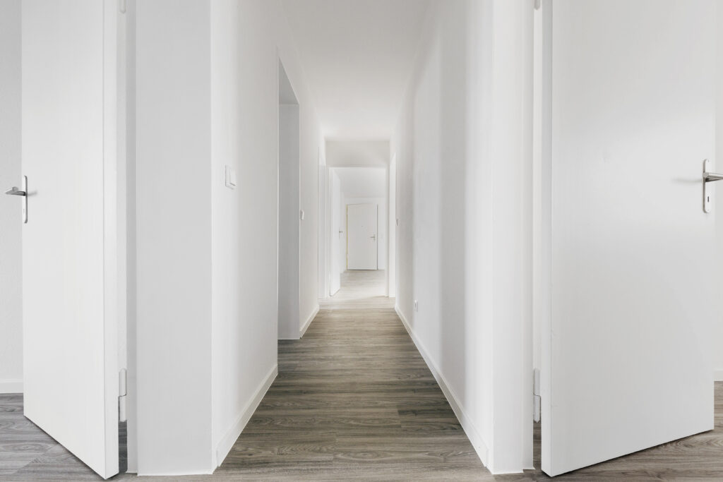 Über einen Flur erreichen Sie sowohl die vier Schlafräume als auch die modernen Bäder mit Badewanne und Dusche. Der Balkon ist über den Koch- und Essbereich zugänglich und bietet zusätzlichen Raum zum Entspannen. Ein Außenstellplatz gehört zu der Wohnung.