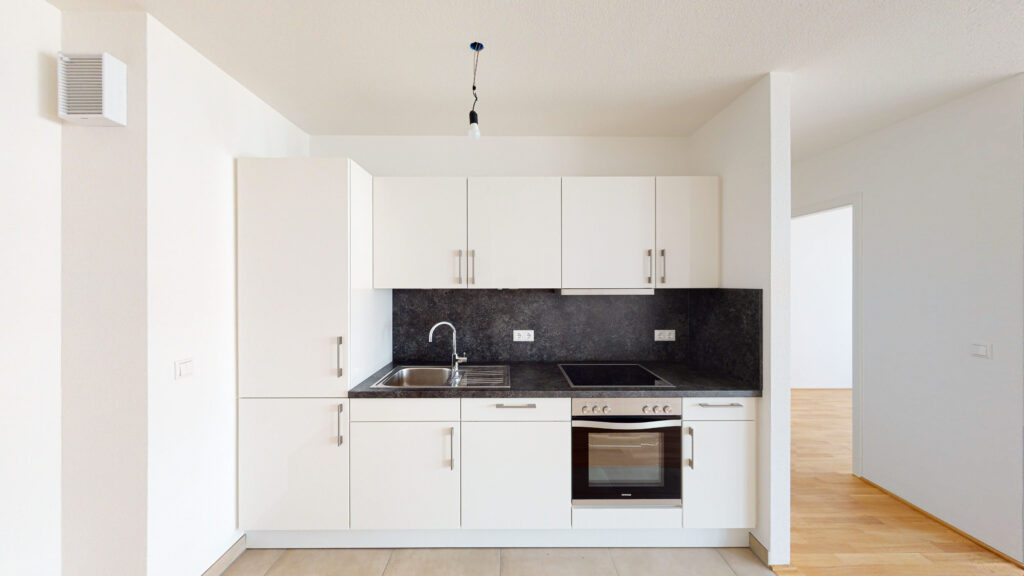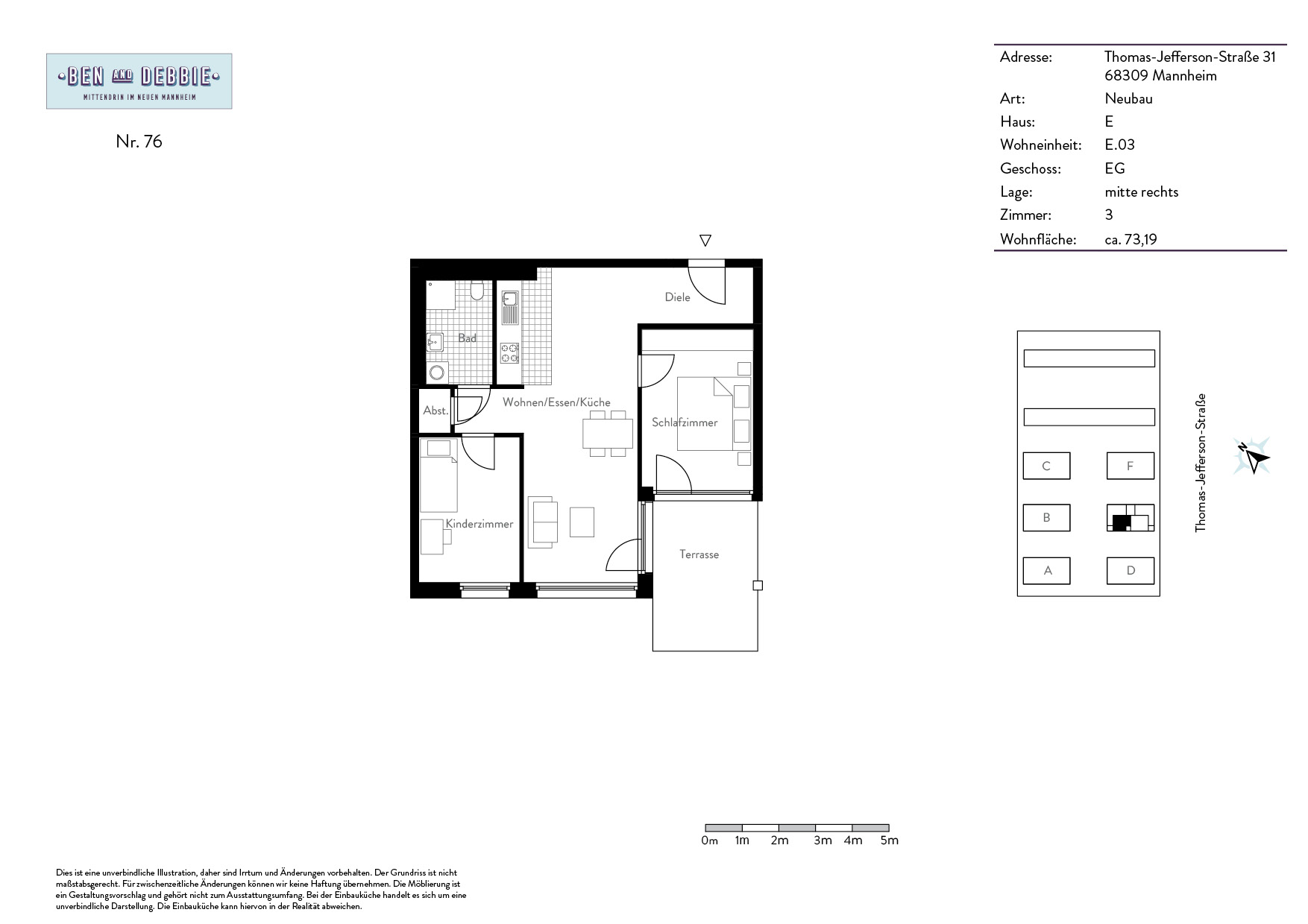 Die hier angebotene 3-Zimmer-Wohnung befindet sich im Ben & Debbie im neuen Stadtviertel Franklin. Die Wohnung verfügt über rund 71 Quadratmeter. Über den offenen Wohn- und Essbereich (mit vollausgestatteter EBK) gelangt man in die beiden Schlafzimmer. Zudem verfügt die Wohnung über ein großes Duschbad mit Waschmaschinenanschluss. Eine Abstellkammer in der Wohnung sowie ein Kelleraum im Untergeschoss bieten zusätzlichen Stauraum. Der Balkon ist über den Wohnbereich und eines der Schlafzimmer begehbar.