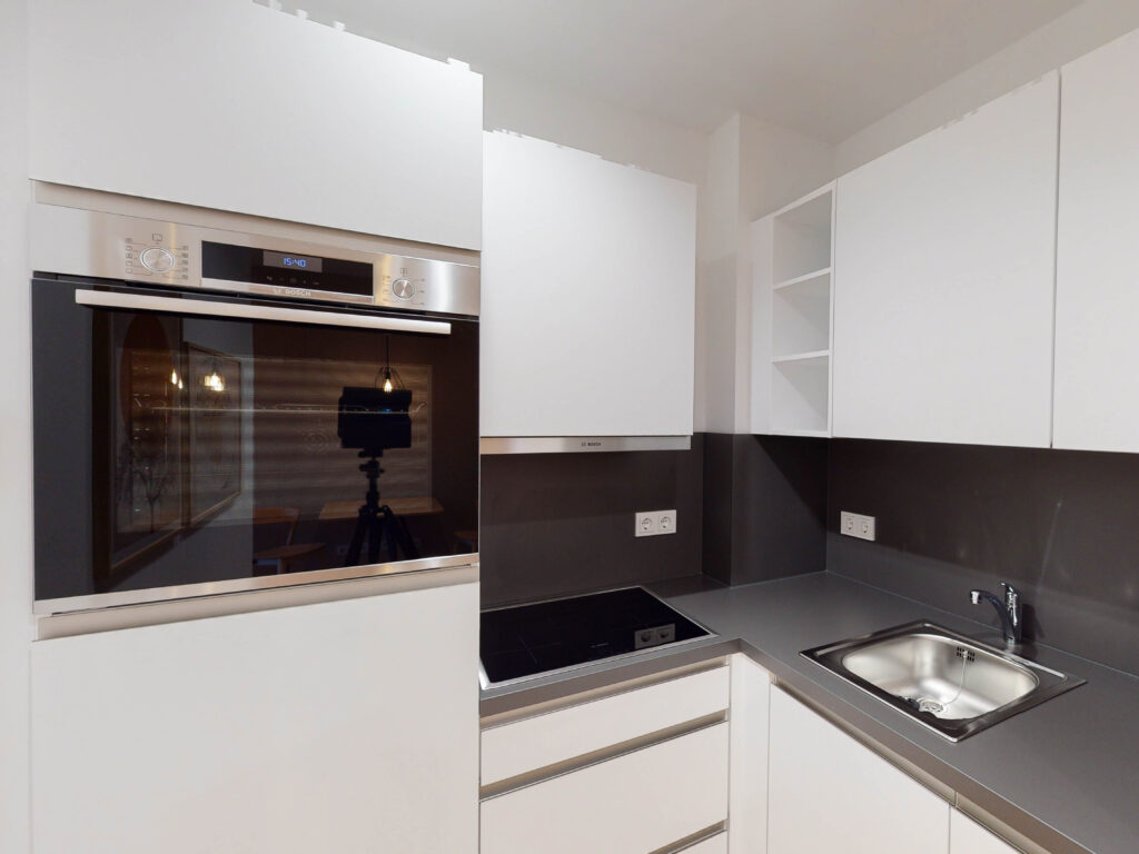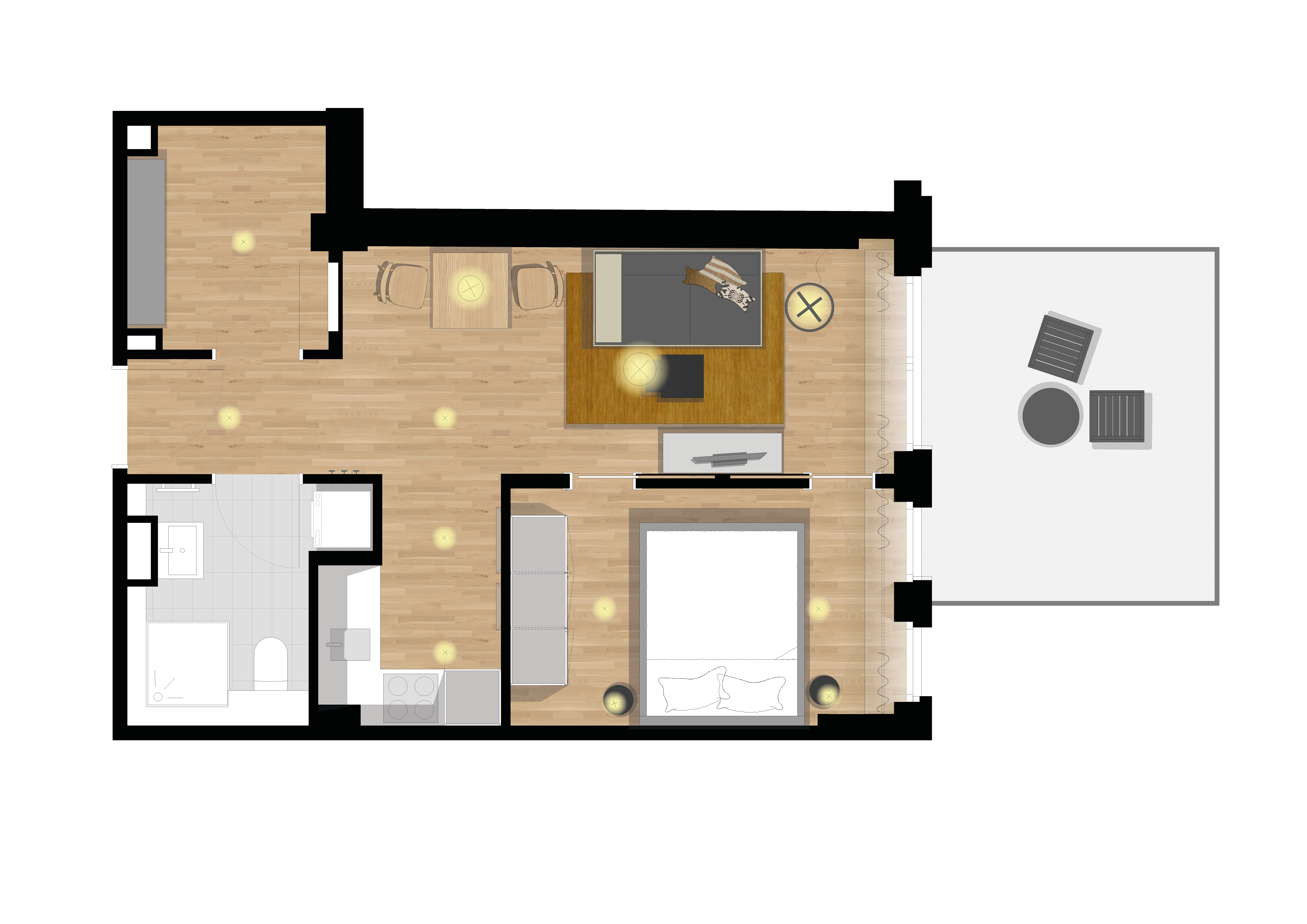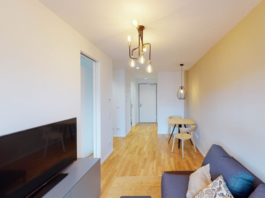 Die hier angebotene Wohnung ist Teil des Projektes B-UP! in Bornheim. Auf 44m² erwartet Sie ein Wohnzimmer mit offener Küche, ein Schlafzimmer sowie ein Duschbad und ein Abstellraum. Zugang zum Balkon in den Innenhof haben Sie vom Wohnzimmer. Neben einer modernen L-Küche sind die Zimmer mit einem Bett, einem Sofa, einem Kleiderschrank, einem Tisch, Stühlen, TV, einem Sideboard und einer Garderobe ausgestattet. Weitere Accessoires wie die Beleuchtung, ein Teppich, Bilderrahmen, Spiegel und Vorhänge runden das Angebot ab.