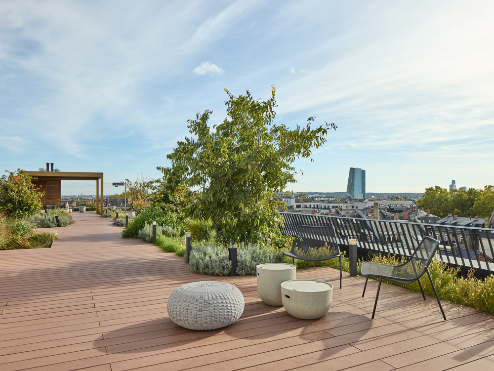 Das absolute Highlight ist das Skyline-Deck, welches sich über die gesamte Dachfläche der Penthouseetage erstreckt. Es steht allen Mietern offen und bietet Outdoormöbel, zwei Pavillons, einen eigenen Sanitärbereich und eine voll ausgestattete sowie individuell buchbare Outdoorküche. Das gesamte Deck begeistert mit einer fantastischen Aussicht auf die Frankfurter Skyline und lädt zum gemeinsamen Sundowner ein.
