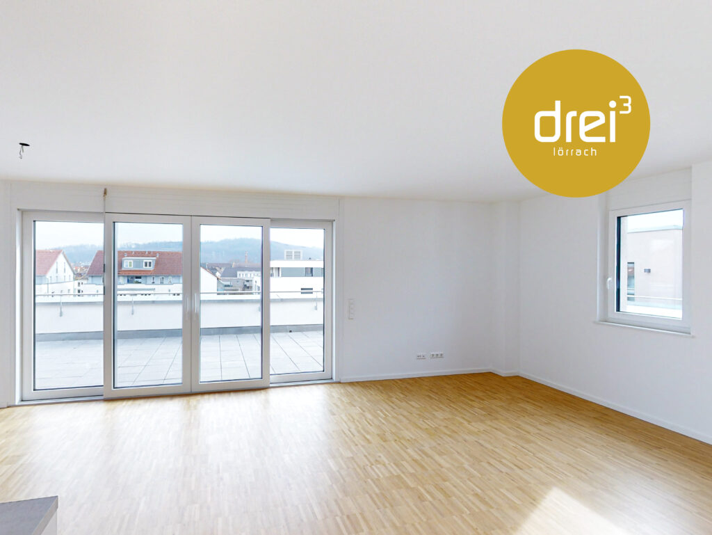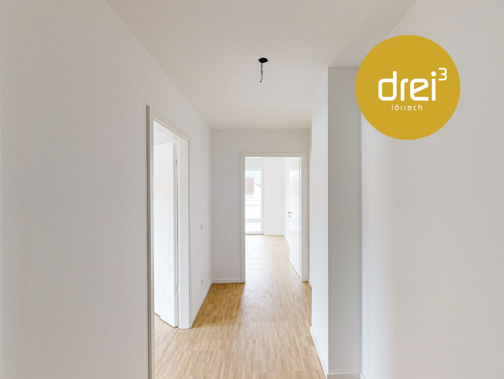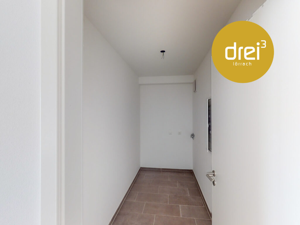 Auf der linken Seite des Flurs befindet sich ein weiteres geräumiges Duschbad und ein Abstellraum mit integriertem Waschmaschinenanschluss. Anschließend gelangt man in den offenen Wohnbereich mit großer Einbauküche und einer hellen Fensterfront welche zur Dachterrasse hinausführt.