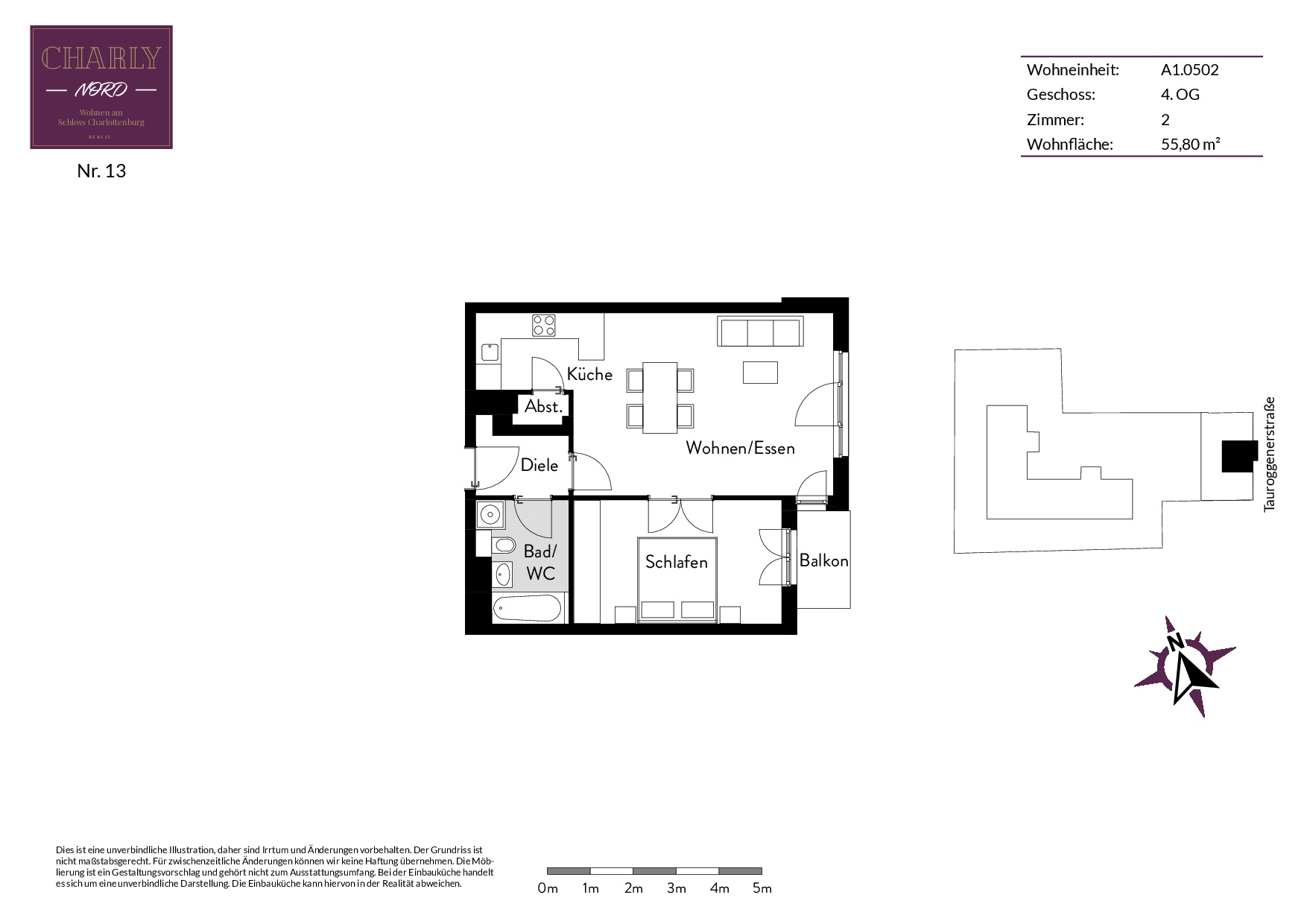 Das Gebäudeensemble besteht aus zwei unabhängigen Gebäudeteilen und steht als KfW-Effizienzhaus 55 für energiesparendes Wohnen. Das sechsgeschossige Vorderhaus zur Tauroggener Straße fügt sich mit seiner sachlichen Fassadengestaltung dezent in die umliegende Architektur. Freitragende Balkone, vorgelagerte Loggien und bodentiefe Fensterfronten erzeugen eine offene und moderne Anmutung.