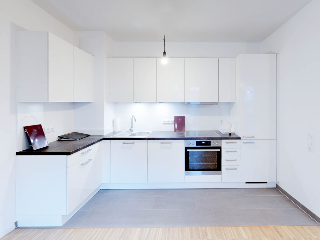Bilder einer Musterwohnung im gleichen Objekt. Der Zuschnitt der angebotenen Wohnung