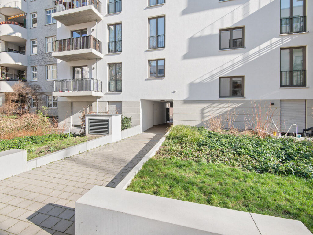 Das ähnlich gestaltete, L-förmige Gartenhaus besteht aus vier Vollgeschossen und liegt im ruhigen und weitläufigen Innenhof. Dieser ist aufwändig begrünt und bietet mit seinen Spielflächen, Sitzgelegenheiten und Blumenbeeten eine hohe Aufenthaltsqualität. Auch Fahrradständer sind vorhanden. Beide Gebäudeteile verfügen jeweils über Aufzüge und sind durch eine gemeinsame Tiefgarage mit 29 PKW-Stellplätzen verbunden.