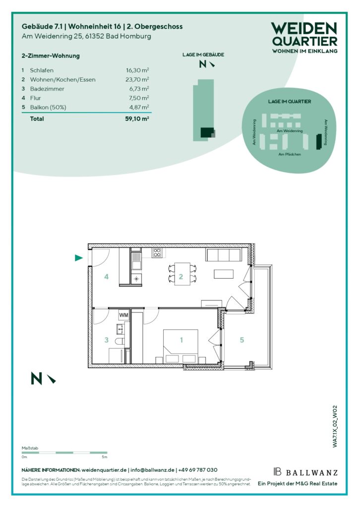 Die gemütliche 2-Zimmer-Wohnung verfügt über ein Schlafzimmer sowie einen kompakten Wohn- und Essbereich mit einer L-förmigen Küche (inkl. Einbauküche). Über das Wohnzimmer gelangt man zum Balkon. Die Wohnung ist mit einem Duschbad und mit einem Waschmaschinenanschluss ausgestattet.