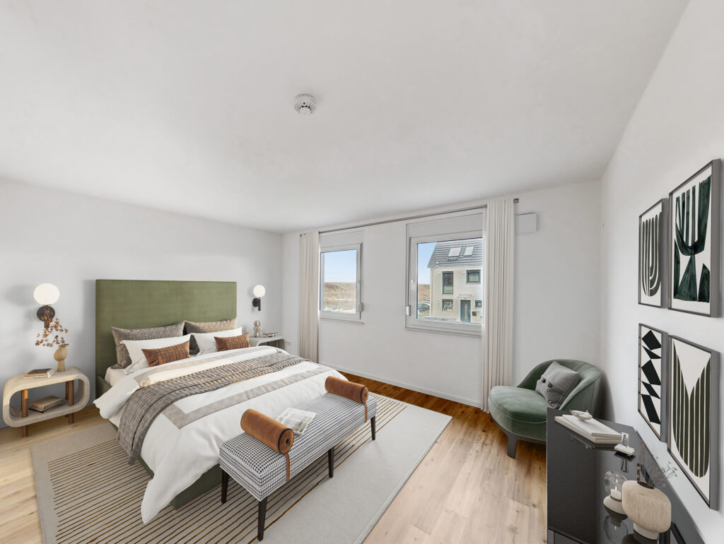 Flächenoptimierte Grundrisse und ein durchdachtes Raumnutzungskonzept machen die Reihenhäuser im Green Living zu einem perfekten Zuhause. Der offene Schnitt der Wohnbereiche, bodentiefe und teil-bodentiefe Fenster für lichtdurchflutete Räume, eine stilvolle Wand- und Bodengestaltung sowie das zeitlose Design der Bäder schaffen eine harmonische Verbindung von Funktionalität und Ästhetik. Hier finden Sie viel Raum für individuelle Gestaltung und ein Wohnambiente, das modernen Ansprüchen gerecht wird.