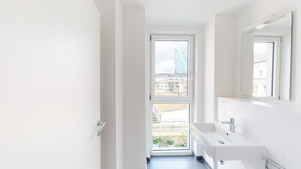 Die Wohnung verfügt über einen großzügigen Wohn- und Essbereich, eine separate Küche, ein geräumiges Schlafzimmer, ein Kinder-/Gäste-/Arbeitszimmer, ein Gäste-Bad mit Dusche und ein Bad mit Badewanne. Des Weiteren bietet ein Abstellraum mit Waschmaschienenanschluss zusätzlichen Stauraum. Die Loggia zur Gerbermühlstraße kann vom Wohnbereich und von einem der Schlafzimmer aus betreten werden. Die Loggia in den Innenhof grenzt an die Küche an.