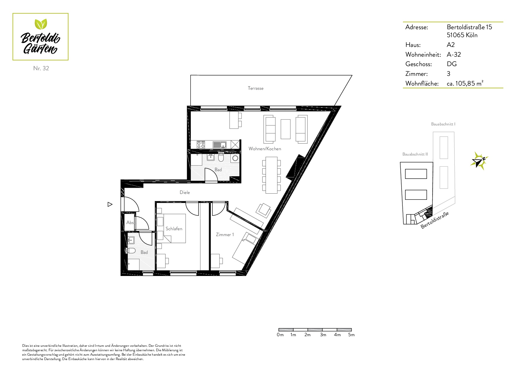 Die hier angebotene Dachgeschosswohnung ist Teil des Neubauprojektes Bertoldi Gärten, in Köln-Mülheim. Sie betreten die Wohnung über einen langen Flur. Von hier aus geht es in den Wohn- und Essbereich mit abgeteilter Küche und Zugang zum großen Dachterrasse. Das großzügige Schlafzimmer, Gästezimmer, sowie beide Duschbäder erreichen Sie über den Flur.