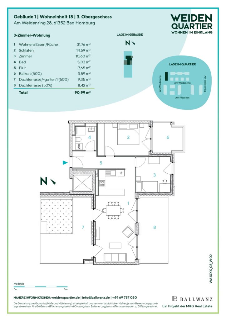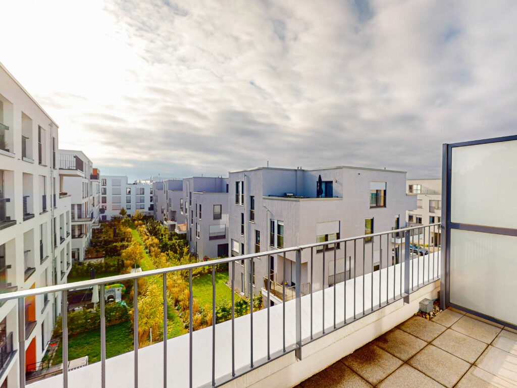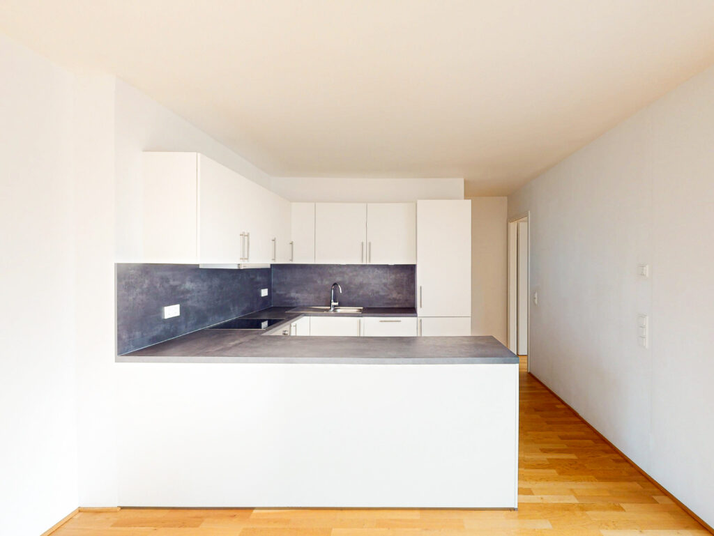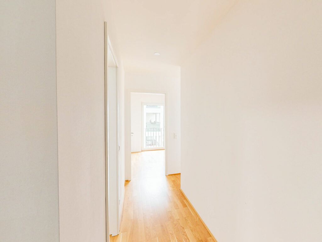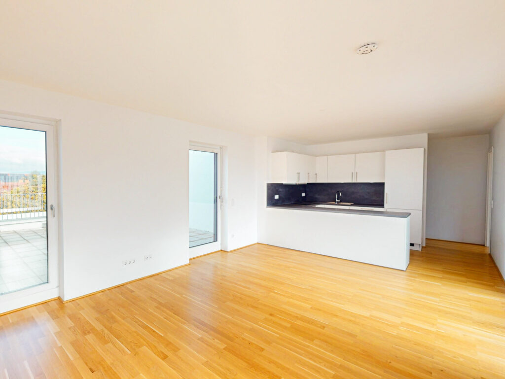 Die großzügige 3-Zimmer-Wohnung verfügt über zwei Schlafzimmer sowie einen geräumigen Wohn- und Essbereich, mit direktem Zugang zu den zwei Dachterrassen. Gegenüber vom Wohnbereich, befindet sich die U-förmige Küche (inkl. Einbauküche). Das moderne Bad (inkl. Waschmaschinenanschluss) ist über den Flur erreichbar.