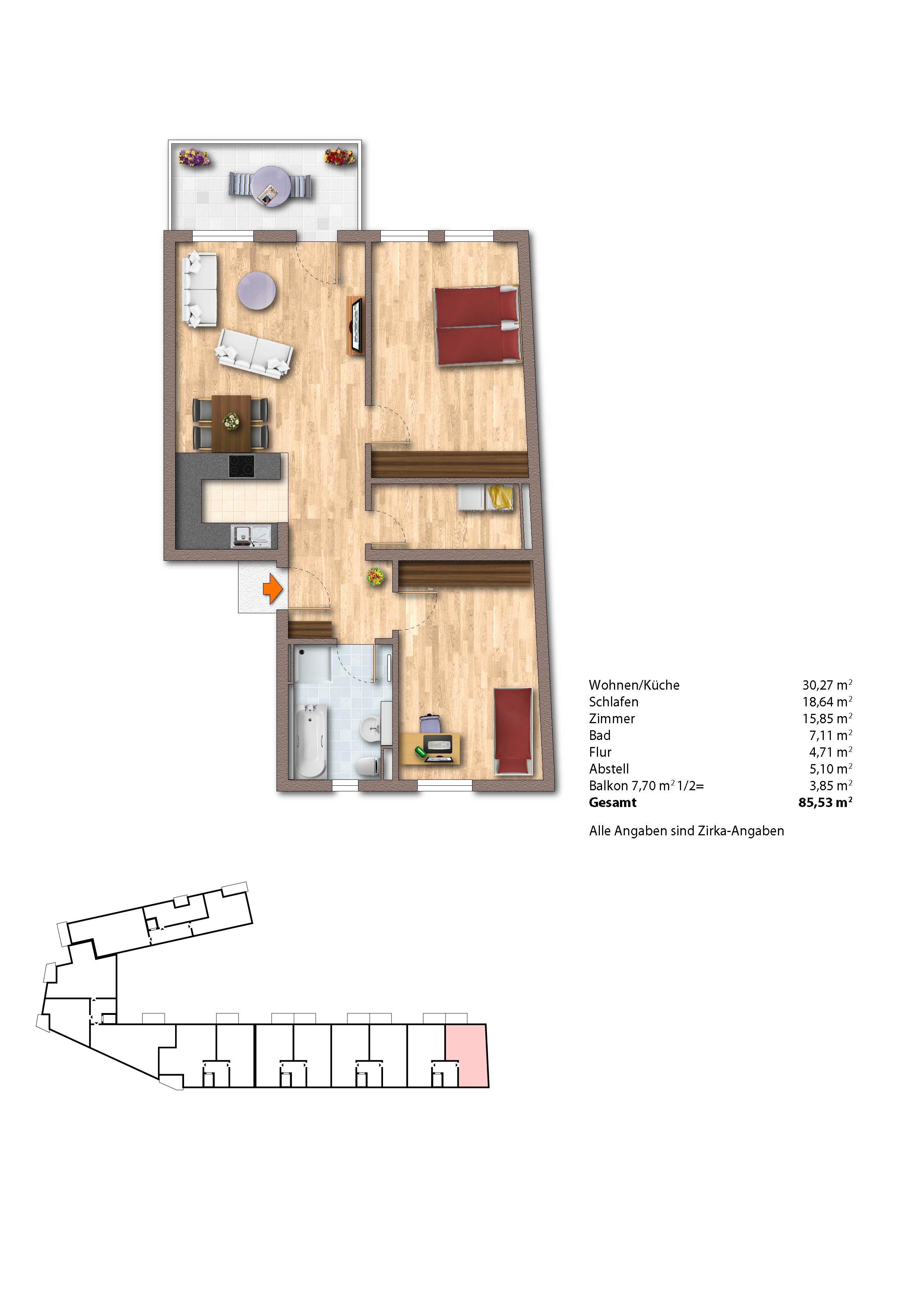 Diese geräumige 3-Zimmer-Wohnung erstreckt sich über 85 m² und bietet einen großzügigen Wohn- und Essbereich, zwei komfortable Schlafzimmer, einen praktischen Abstellraum, ein modernes Bad sowie einen einladenden Flur. Genießen Sie zudem entspannte Momente auf dem Balkon.