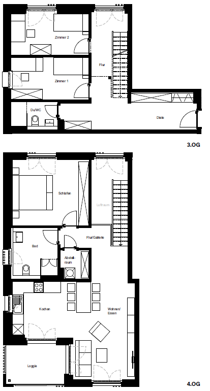 Im ersten Stockwerk dieser Wohnung finden sich zwei Schlafzimmer, sowie ein modernes Duschbad. Über die Treppe gelangen Sie in die zweite Etage, welche über ein weiteres Schlafzimmer, ein Tageslichtbad und einer Abstellkammer verfügt. Treffpunkt für die ganze Familie ist das Wohn- und Esszimmer mit moderner Einbauküche. Die angrenzende Loggia lädt zum Verweilen ein.