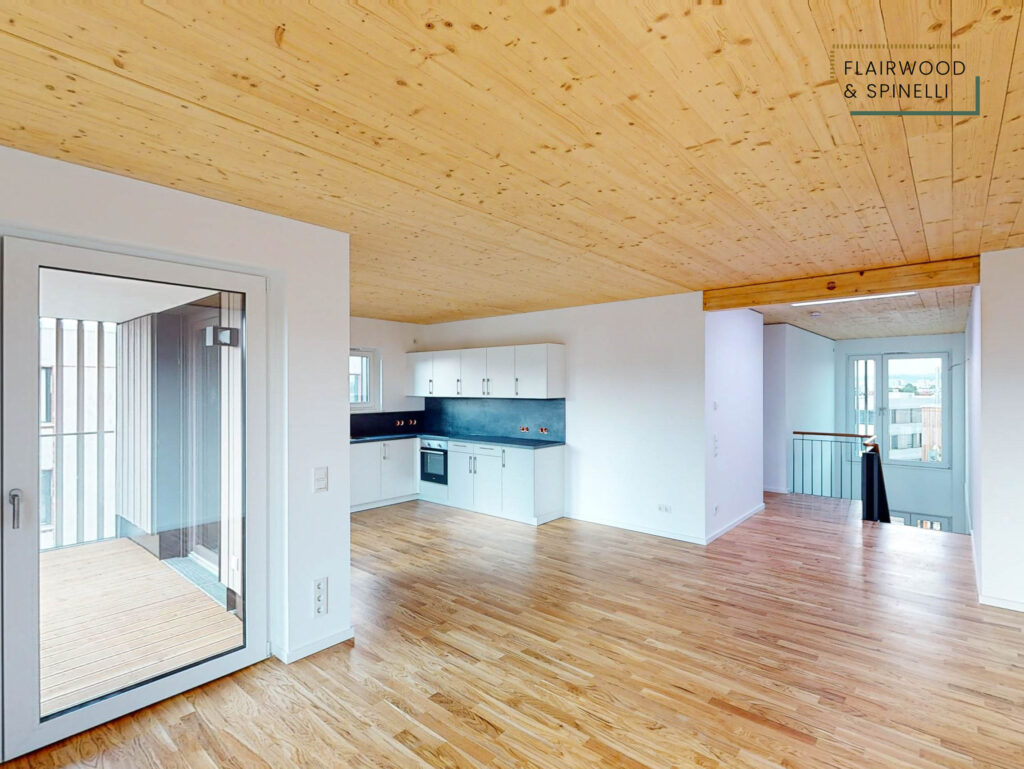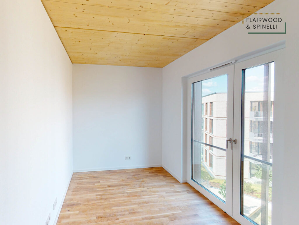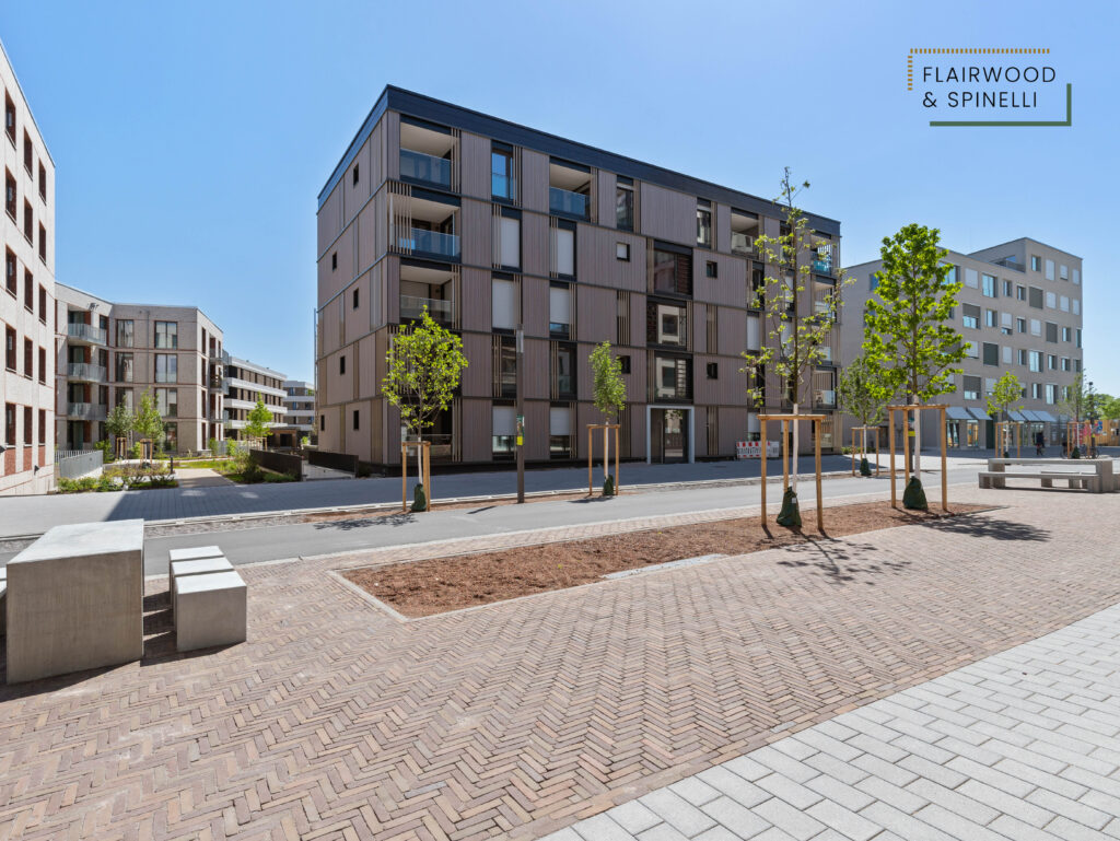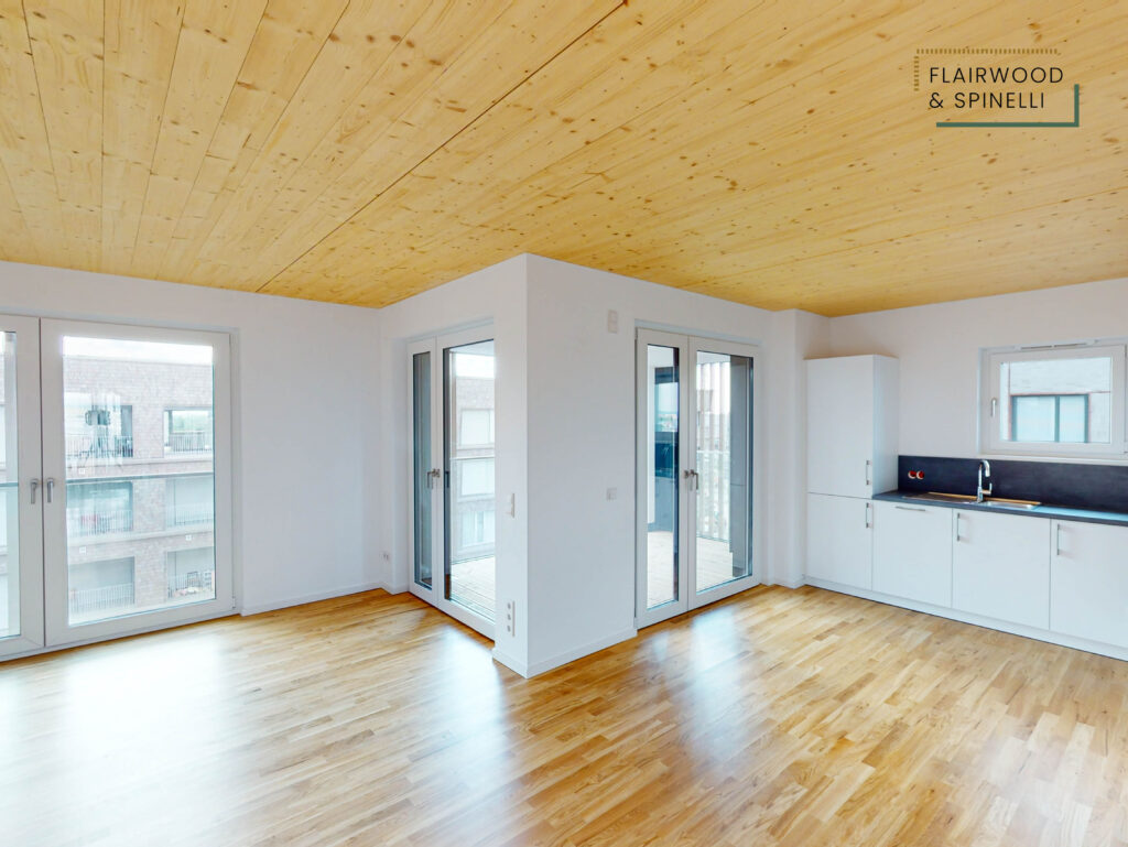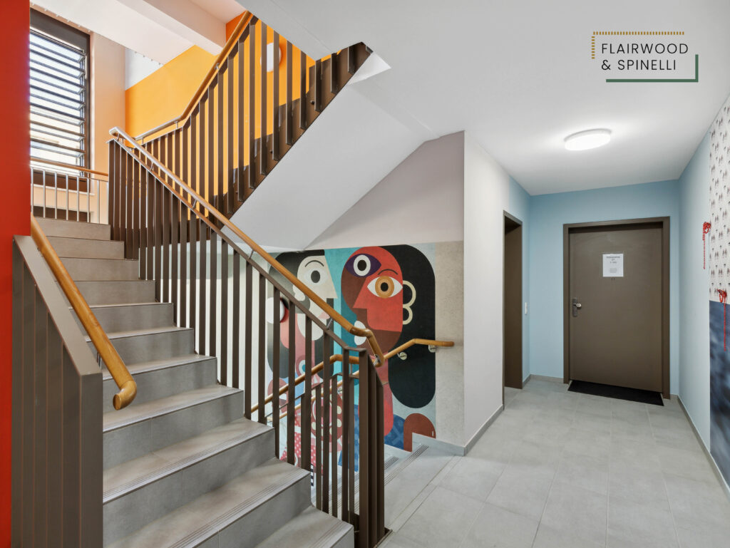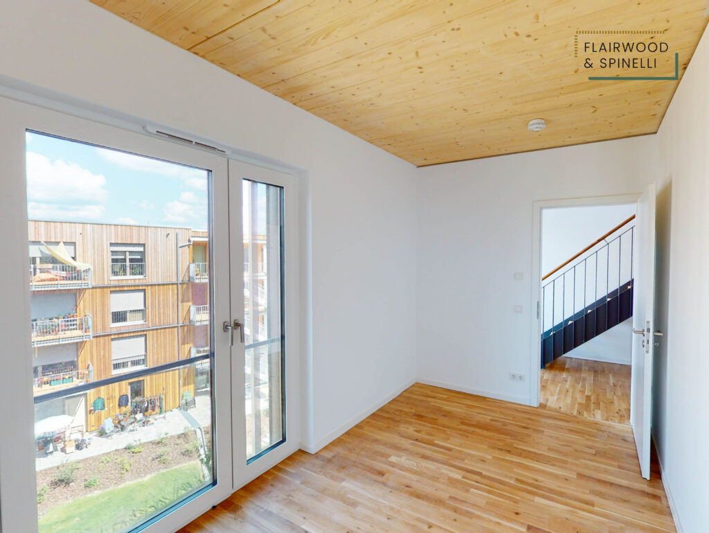 Insgesamt stehen im FLAIRWOOD & SPINELLI 45 Wohnungen und 3 Wohngemeinschaften mit 1- bis 4-Zimmer-Wohnungen zur Verfügung, ergänzt um eine Quartiersgarage mit PKW-Stellplätzen. Die begrünte Außenanlage bietet Sitzflächen und dient als Begegnungsort des Quartiers.