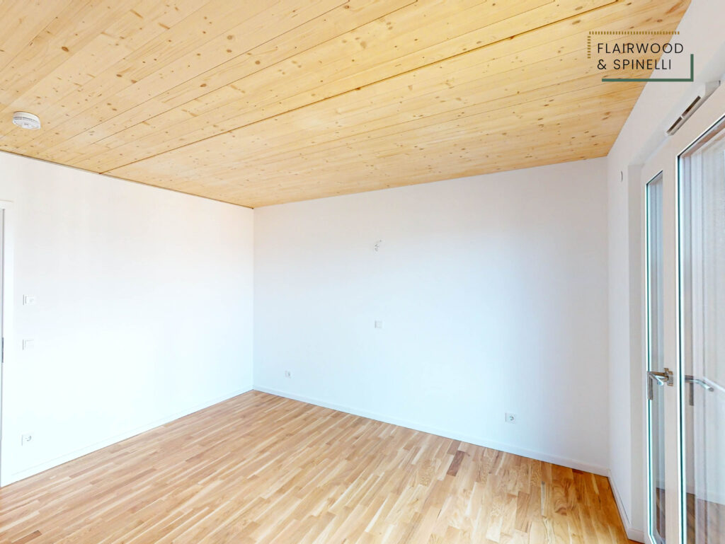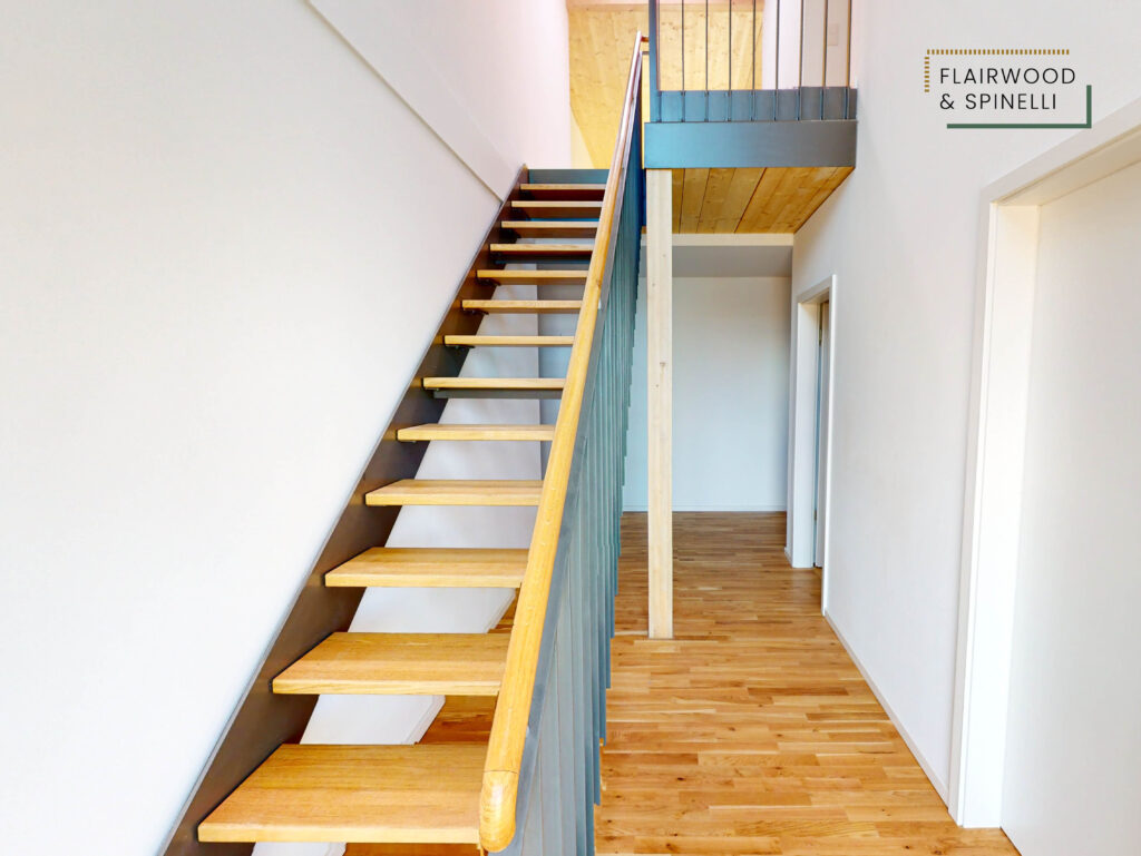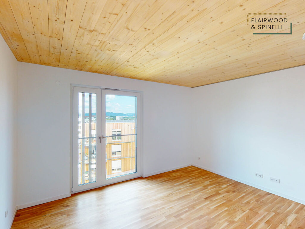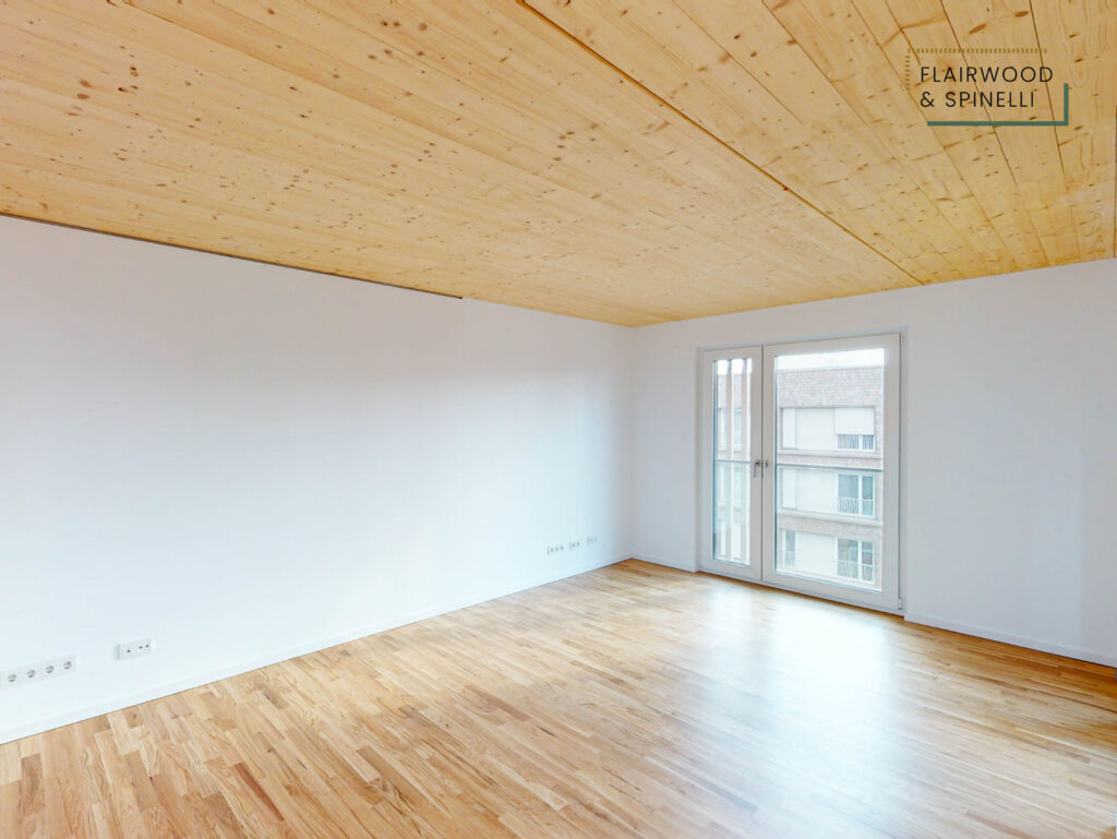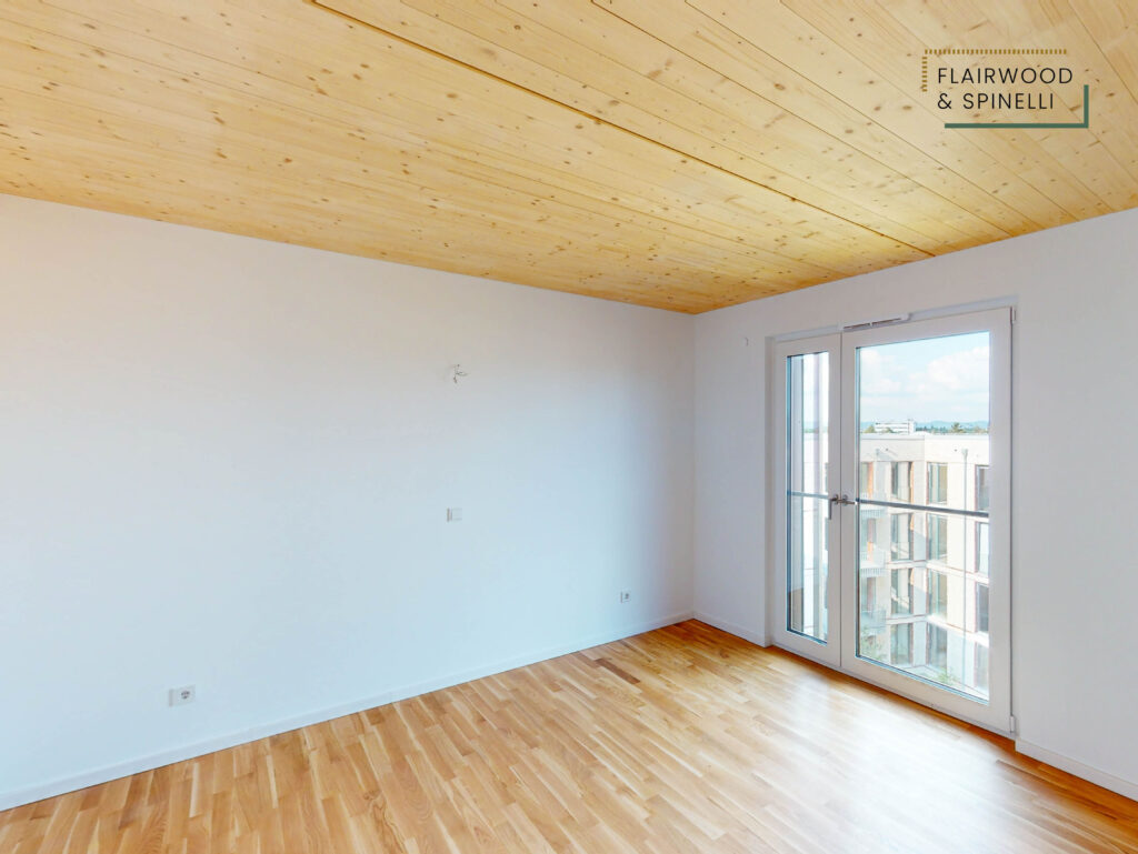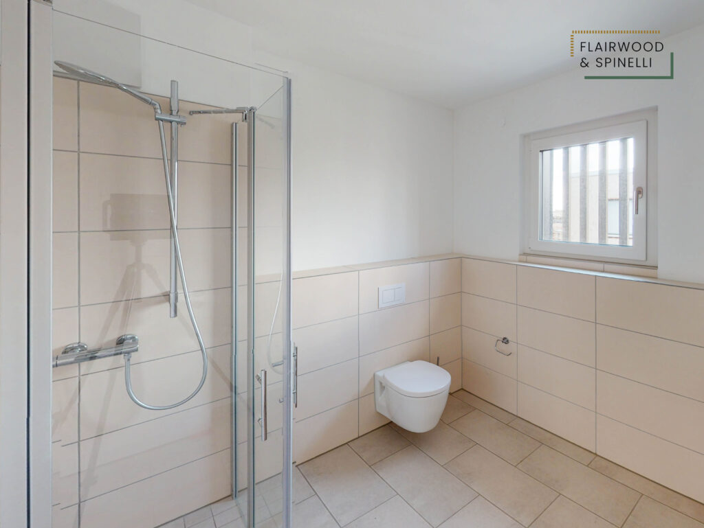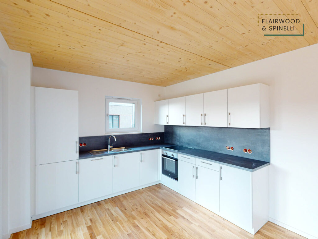Insgesamt stehen im FLAIRWOOD & SPINELLI 45 Wohnungen und 3 Wohngemeinschaften mit 1- bis 4-Zimmer-Wohnungen zur Verfügung, ergänzt um eine Quartiersgarage mit PKW-Stellplätzen. Die begrünte Außenanlage bietet Sitzflächen und dient als Begegnungsort des Quartiers.