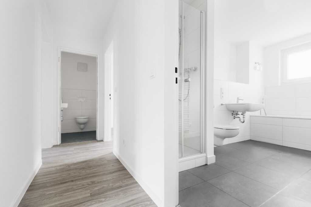 Über einen Flur erreichen Sie sowohl die 3 Schlafräume als auch das moderne Bad mit Badewanne und Dusche. Die Wohnung verfügt zudem über ein separates Gäste-WC. Der Balkon ist über den Koch- und Essbereich zugänglich und bietet zusätzlichen Raum zum Entspannen. Ein Außenstellplatz gehört zu der Wohnung.