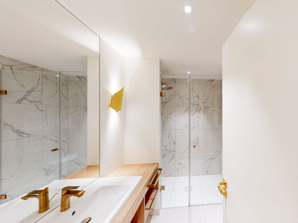 Das hier angebotene Studioapartment verfügt über einen geräumigen Wohn-/Ess-/Schlafbereich mit durchdachtem Schrankkonzept. Bodentiefe Fenster mit vorgelagertem Balkon sorgen für viel Licht im Raum. Ein modernes Duschbad mit Fliesen in Mamoroptik und goldenen Armaturen rundet das Profil dieses exklusiven Apartments ab.