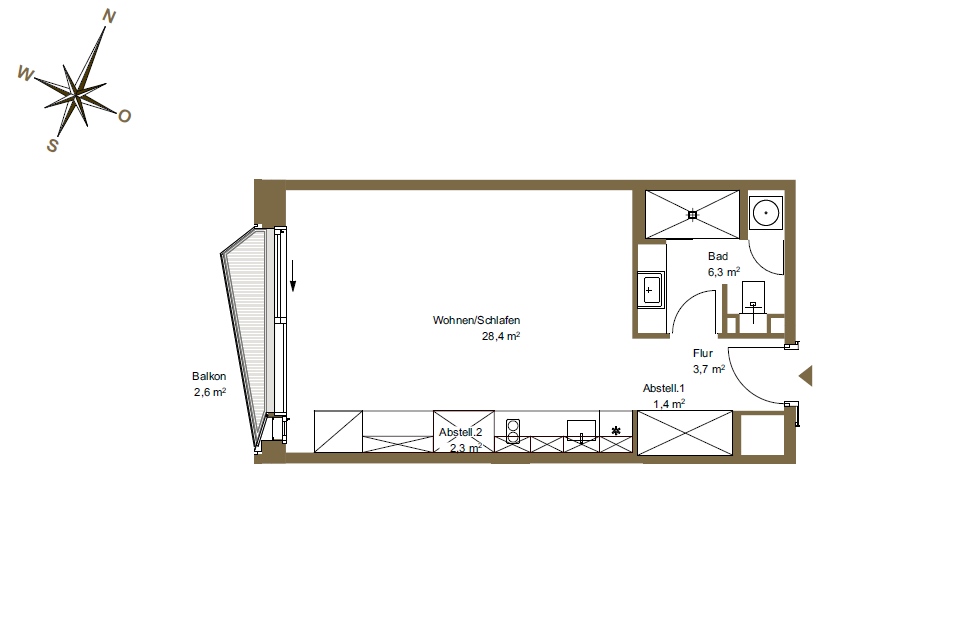 Das hier angebotene Studioapartment verfügt über einen geräumigen Wohn-/Ess-/Schlafbereich mit durchdachtem Schrankkonzept. Bodentiefe Fenster mit vorgelagertem Balkon sorgen für viel Licht im Raum. Ein modernes Duschbad mit Fliesen in Mamoroptik und goldenen Armaturen rundet das Profil dieses exklusiven Apartments ab.