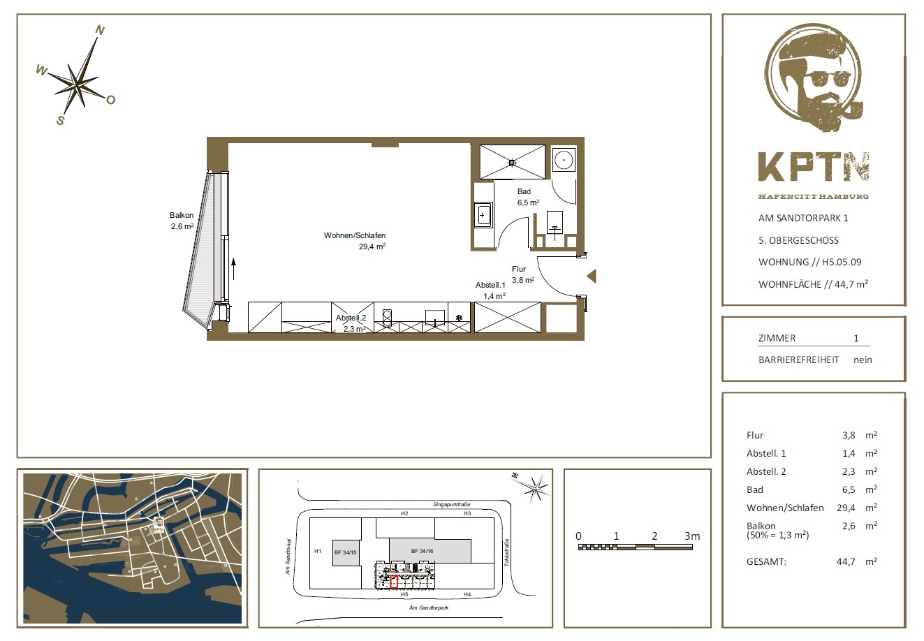 Das Neubauensemble KPTN bietet anspruchsvollen Wohnraum im zukünftigen Lebensmittelpunkt der Metropole Hamburg. Das Quartier besteht aus insgesamt fünf Gebäuden, die eine Gesamtfläche von rund 33.000 Quadratmetern bieten. Zwischen den Gebäudekomplexen liegt eine öffentliche Piazza als Passage zwischen der Straße „Am Sandtorpark“ und der „Singapurstraße“.