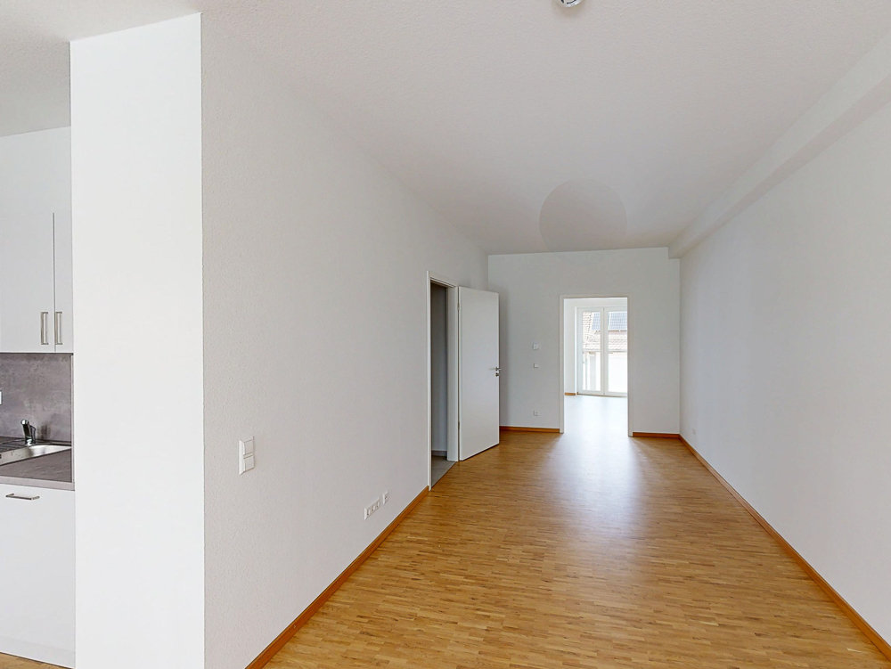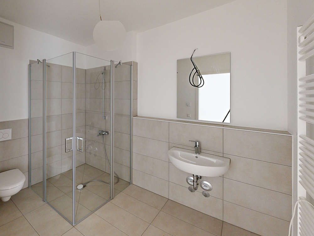 Im Eingangsbereich befindet sich eine kleine Nische für eine Gaderobe und anschließend eröffnet sich der helle Wohnbereich inklusive einer modernen Einbauküche und dem Zugang zur Terrasse. Folgt man dem Wohnbereich weiter befindet sich auf der linken Seite das moderne Duschbad, ein geräumiger Abstellraum sowie am Ende das große Schlafzimmer.