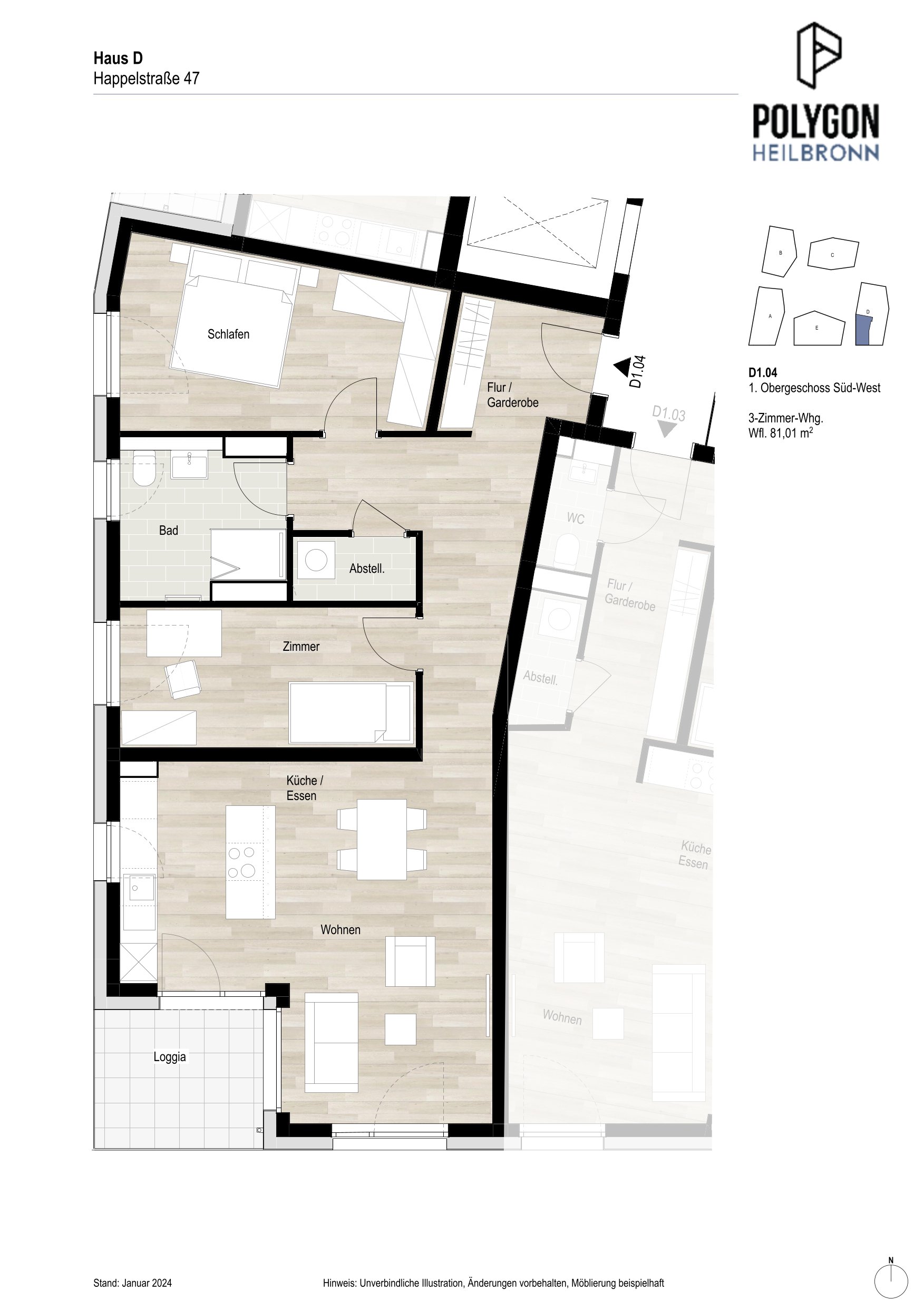 Das Wohnbauprojekt POLYGON umfasst den Neubau von fünf Mehrfamilienhäusern auf einem ca. 3.287 m2 großen Grundstück an der Happelstraße in Heilbronn. Auffallend sind die außergewöhnliche Architektur der Gebäude, deren polygonale Formen unterschiedliche Traufhöhen ergeben und spannende räumliche Situationen schaffen. Jede Gebäudeseite besticht mit einer individuellen Optik und Kubatur – und ohne die sonst übliche Einteilung der Fassaden in Vorder- und Rückseite. Ein zentraler begrünter Innenhof erschließt die Wohngebäude und die gemeinsame zweigeschossige Tiefgarage. Neben Anforderungen an ein KfW-Effizienzhaus 55 (GEG) erfüllen sämtliche Gebäude auch die Vorschriften des Schallschutzes und verfügen über eine effiziente Be- und Entlüftungstechnik. Sie werden nach den Standards der EnEV 2016 errichtet und erhalten wärmegedämmte Außenwände sowie eine Dachbegrünung. Insgesamt entstehen im POLYGON 69 freifinanzierte und 20 geförderte Wohneinheiten sowie 92 Stellplätze in der Tiefgarage. Der Wohnungsmix umfasst 1,5- bis 4-Zimmer-Wohnungen mit Wohnflächen von 35 bis 147 m2.