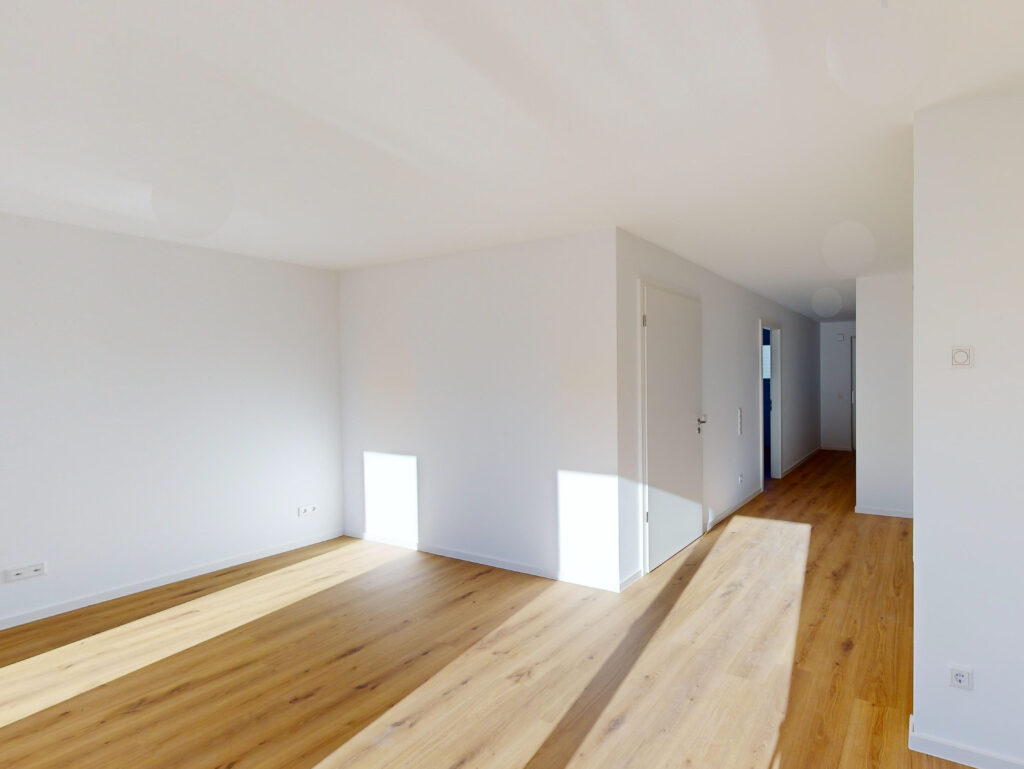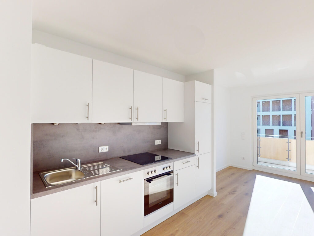 Die quadratisch geschnittene 2-Zimmer-Neubauwohnung ist über einen Laubengang erreichbar und wird in einem geräumigen Flur betreten. Daran anschließend finden Sie das Schlafzimmer, ein Abstellraum und ein Duschbad mit Waschmaschinenanschluss. Entlang an einem offenen Küchenbereich inklusive einer Einbauküche gelangt man in das helle Wohnzimmer, wovon der Zugang zum Balkon/zur Terrasse möglich ist.