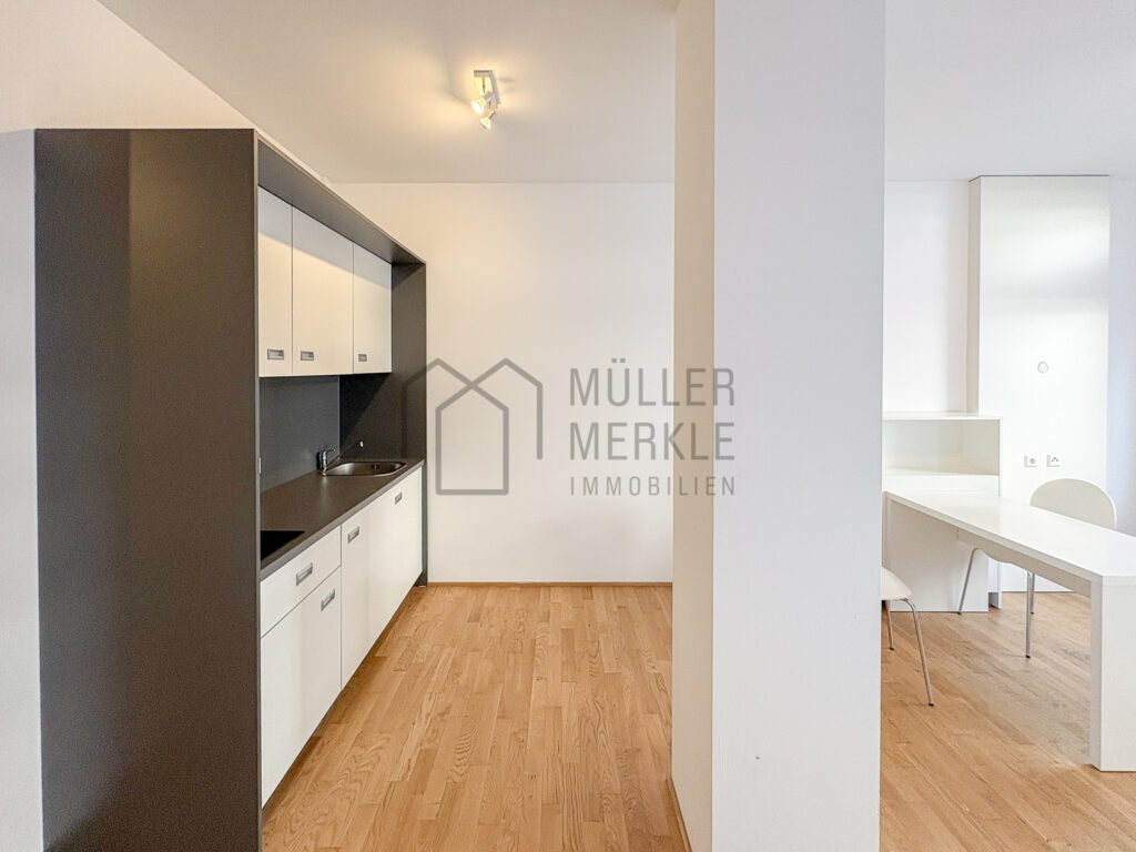 Die offene Raumgestaltung und die moderne Einrichtung machen dieses Apartment besonders attraktiv. Bett, Tisch, Stühle und Beleuchtung sowie weitere Details sind bereits vorhanden. Das Bad ist zeitgemäß ausgestattet mit einer begehbaren Dusche.