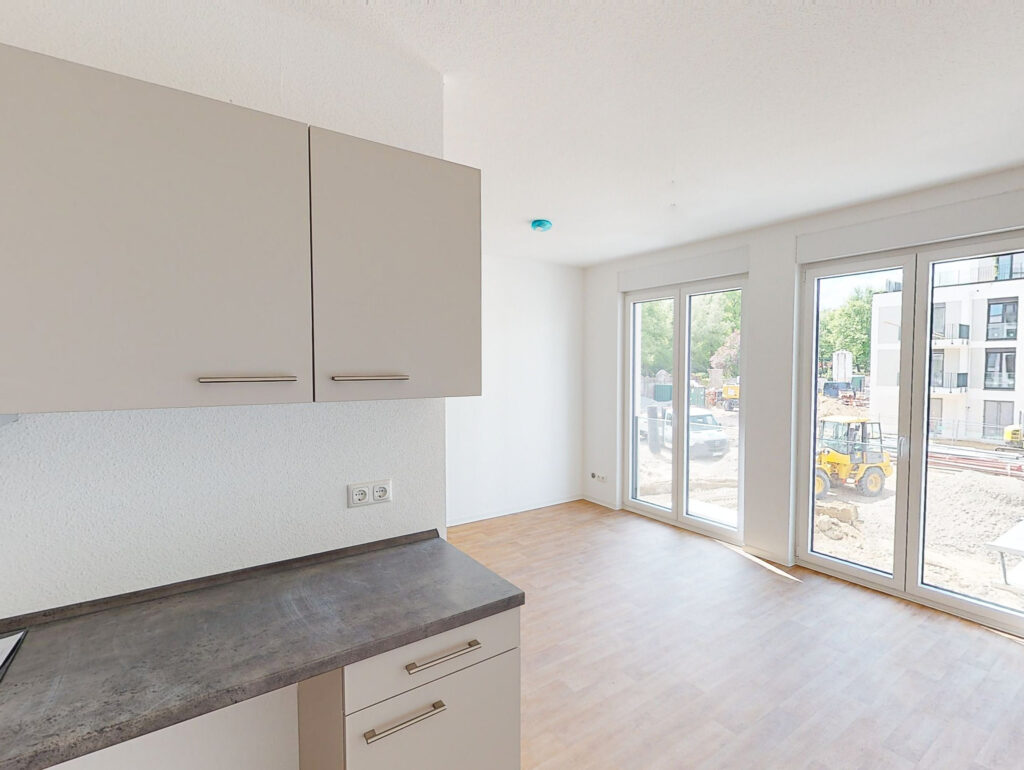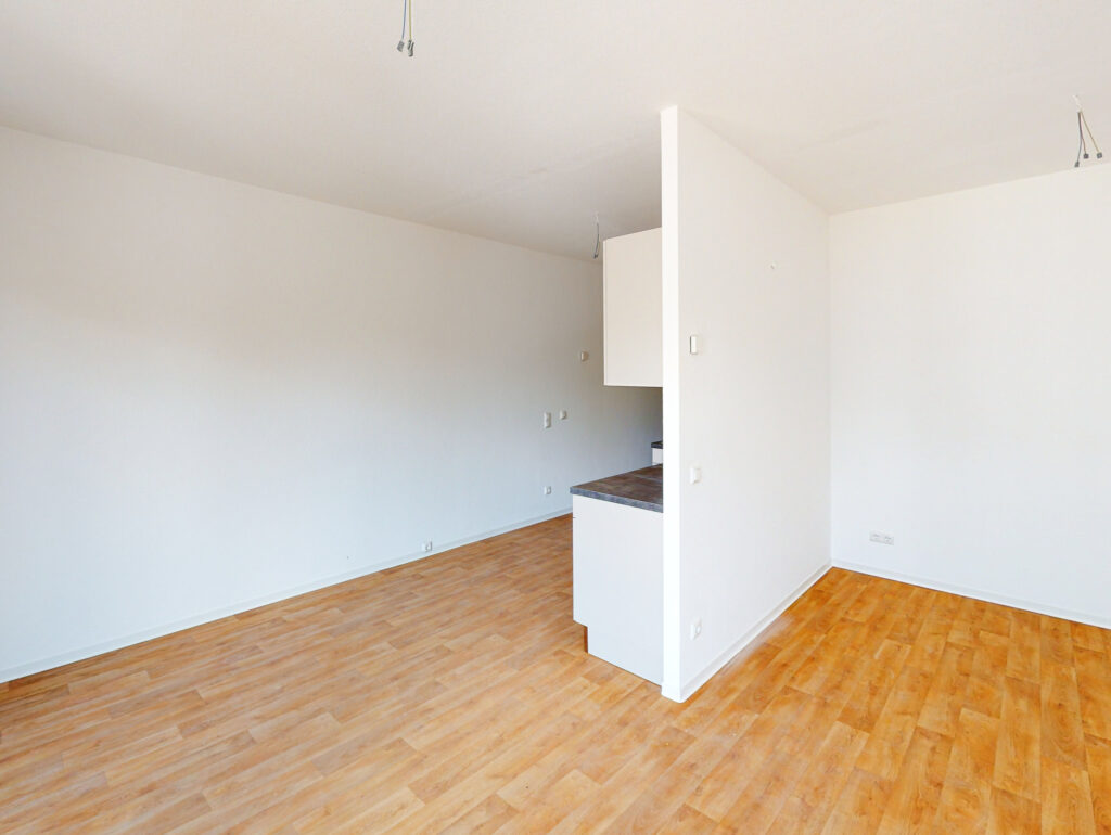 Unsere Beispielwohnung punktet mit einer modernen Studioanmutung und einem offenen Küchenbereich sowie einer Einbauküche
