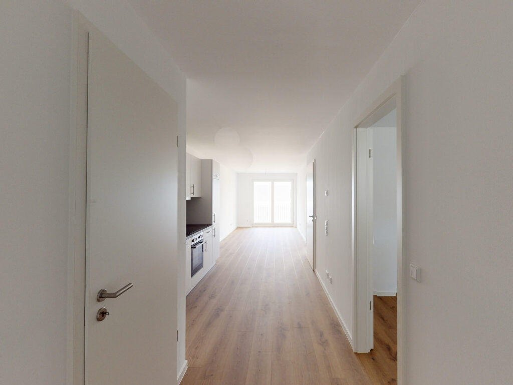 Die quadratisch geschnittene 3-Zimmer-Neubauwohnung ist über einen Laubengang erreichbar und wird in einem geräumigen Flur betreten. Daran anschließend finden Sie das kleinere der beiden Schlafzimmer und einen Abstellraum. Weiter auf der linken Seite befindet sich ein Duschbad mit Waschmaschinenanschluss. Entlang an einem offenen Küchenbereich inklusive einer Einbauküche gelangt man in das helle Wohnzimmer, wovon der Zugang zum Balkon/zur Terrasse möglich ist. Von hier ist das zweite größere Schlafzimmer erreichbar.