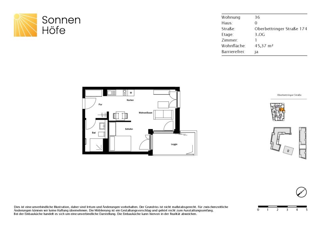 Sie verfügt über kompakte 44,85 Quadratmeter mit einem offenen Wohn- und Kochbereich, welcher Zugang zu einer schönen Loggia bietet. Über den Eingangsbereich gelangt man in ein modernes Duschbad. Das Schlafzimmer ist etwas vom Wohnbereich abgetrennt.